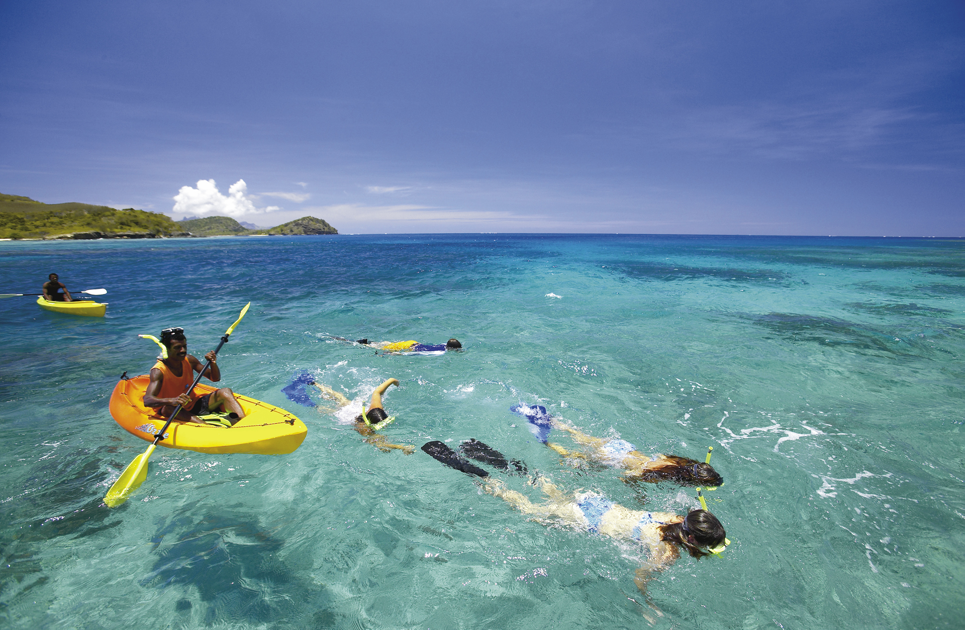 Vor dem Frühstück Zeit für eine kleine Kajaktour oder Schwimmen und Schnorcheln, Fahrt zu den Sacred Islands, 4 Inseln in einer traumhaften Lagune in der nördlichen Mamanuca Gruppe. Es heisst, dass dies die Geburtsstätte Fijianischer Kultur und Legenden ist. Mittagessen an Bord und dann erfolgt der Transfer zurück nach Port Denarau in einem Hochgeschwindigkeits Katamaran.