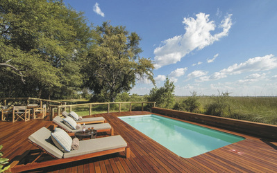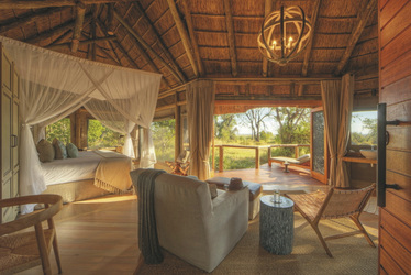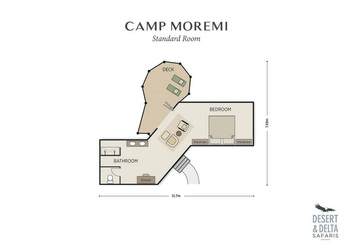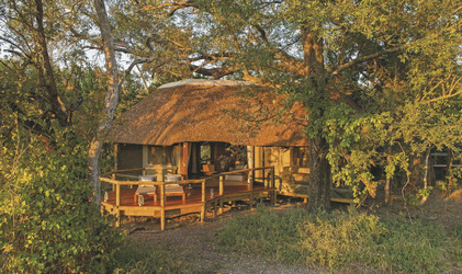Dezente Dekorelemente und Beleuchtungen schaffen in jedem der 12 großzügigen, modern gestalteten strohgedeckte Safarizelte, darunter ein Familienzimmer, eine natürliche und warme Atmosphäre und sorgen für eine harmonische Verbindung mit der Umgebung. Alle Zelte verfügen über großzügige Bäder mit Doppelwaschbecken und Duschen sowie private Terrassen mit Blick auf das Moremi Wildreservat. Das Familienzimmer, das zwei separate Schlafzimmer und Badezimmer umfasst, ist durch Verbindungstüren verbunden.