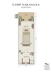 Zwölf große, luxuriöse Zelte stehen auf hölzernen Plattformen, davon ein Familienzelt. Alle haben eine eigene Terrasse und ein Badezimmer mit Waschbecken, Dusche und Spültoilette. Die insektengeschützten Zelte sind komfortabel mit großen Betten, Nachttischen, Kommode, Safe, Schminktisch mit Spiegel und Ablagemöglichkeiten eingerichtet. Eine Steckdose für einen Fön und zum Aufladen von Batterien ist vorhanden, ebenso ein Ventilator.