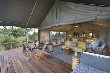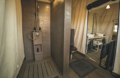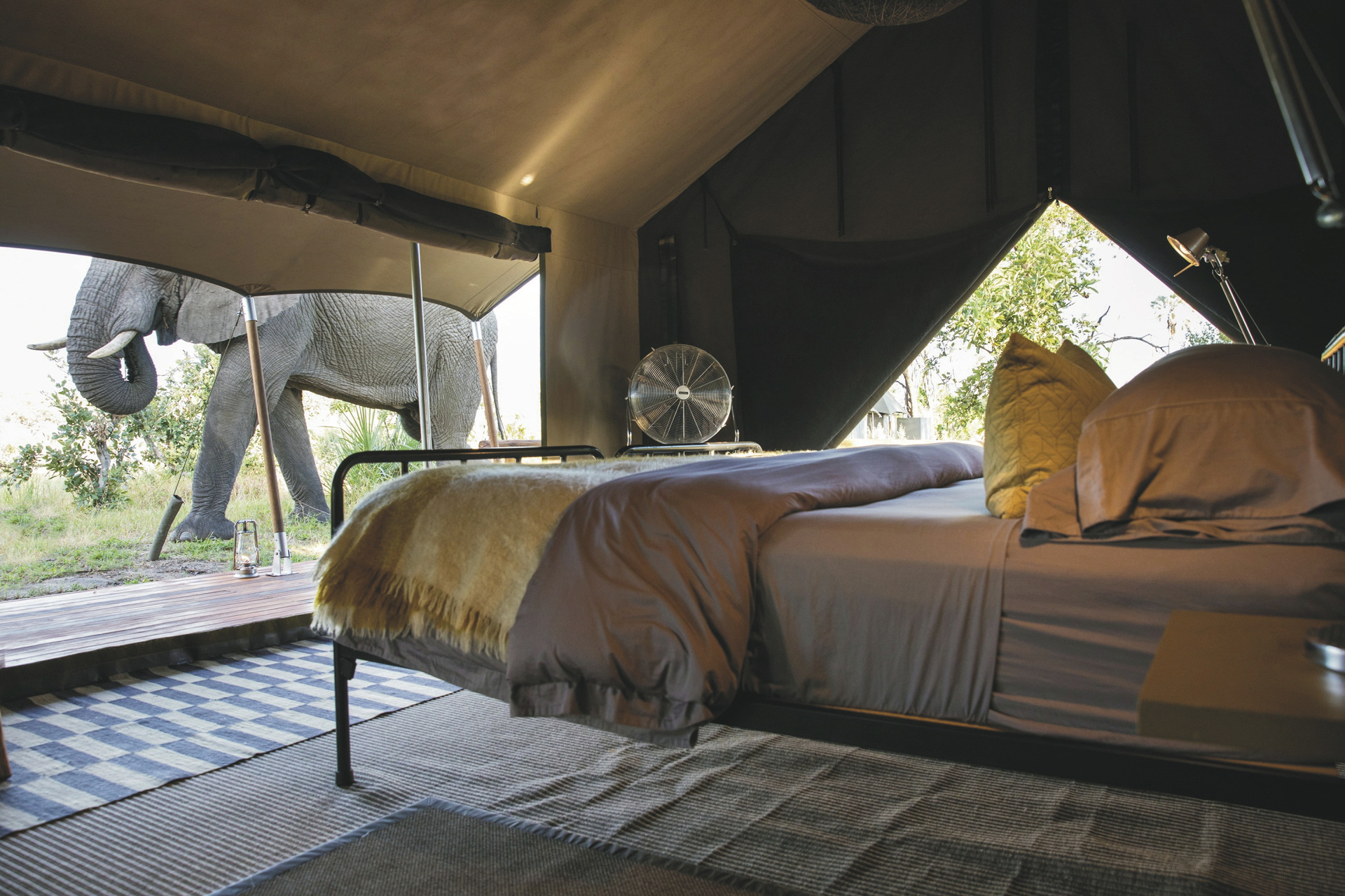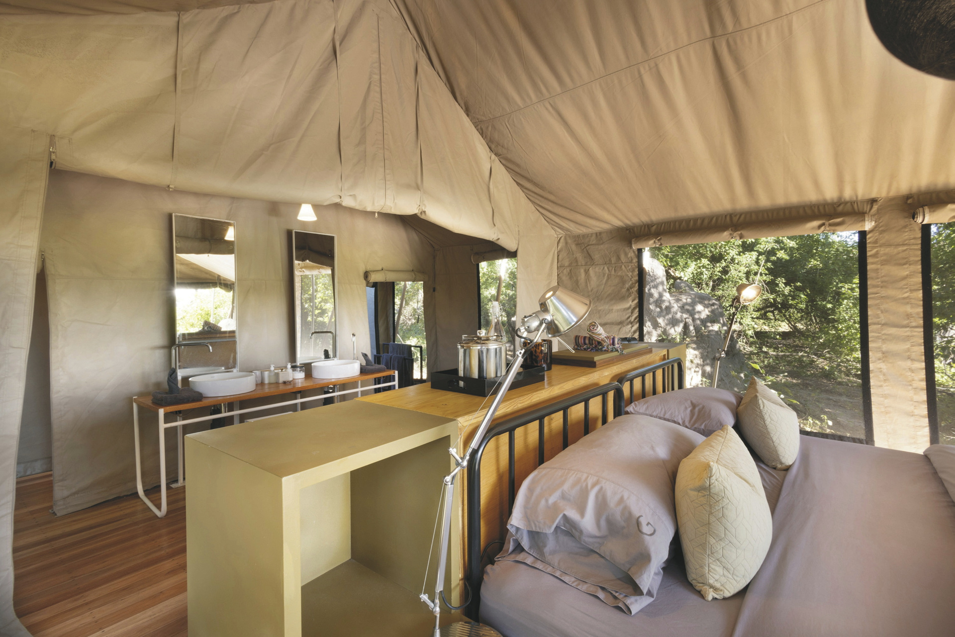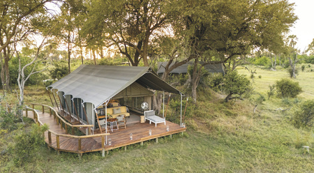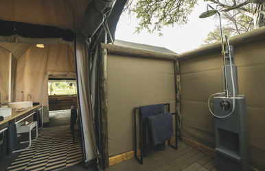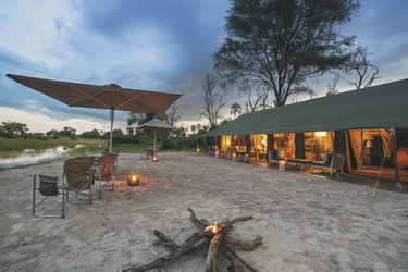 Acht Safarizelte und zwei Familienzelte jeweils mit integriertem Bad/DU/WC und Blick auf den Gomoti Fluss. Eine besondere Erfrischung bietet die Außendusche. Die Beleuchtung erfolgt über Solarstrom.