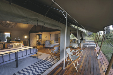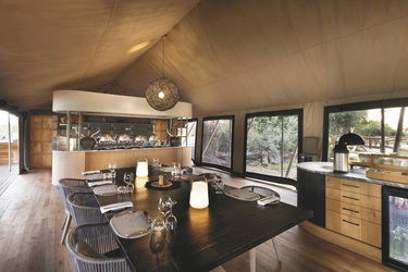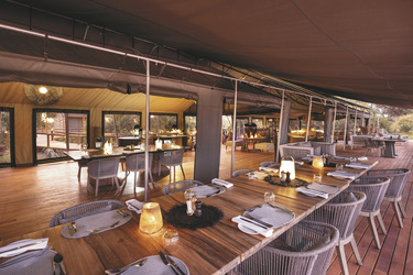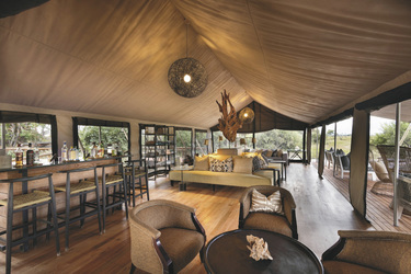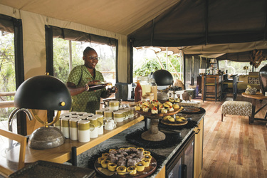 Das Hauptzelt ist eingebettet in eine üppige Vegetation und beherbergt die Rezeption, den Speisebereich, die Bar, Lounge und Bibliothek. Ein Pool und ein offener Feuerplatz laden zum Verweilen und Entspannen ein.