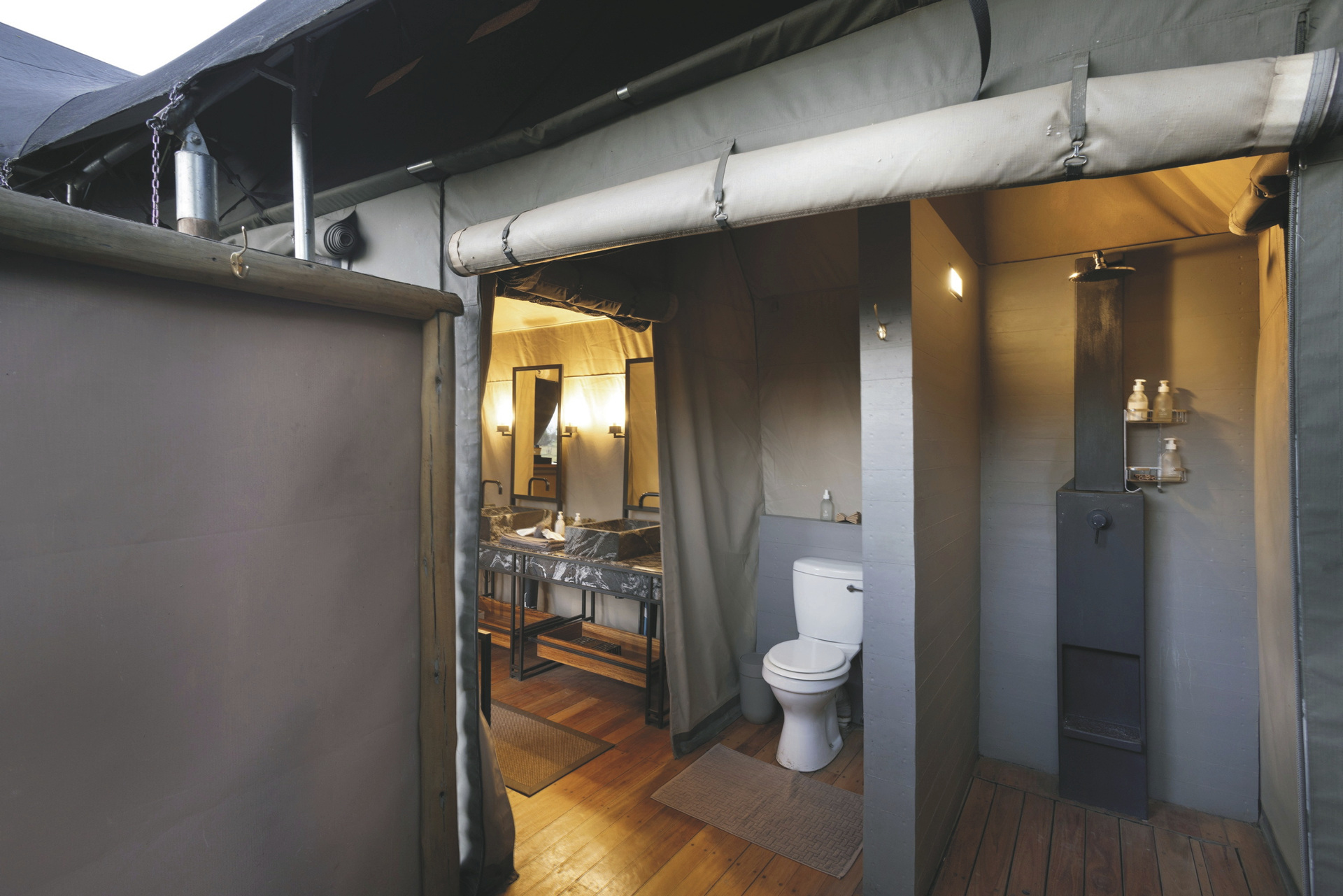 Die zwei großzügigen Safarizelte (Doppel- und Familienzelt) verfügen über ein modernes integriertes Bad/WC sowie eine Außendusche und Badewanne, die zu erfrischenden Momenten unter dem Sternenhimmel einladen. Die Zelte bieten genügend Platz zum Entspannen, sowohl im Innenbereich als auch auf der Terrasse mit Blick in die Wildnis. Das Familienzelt besteht aus zwei Schlafzimmern und zwei Badezimmern.