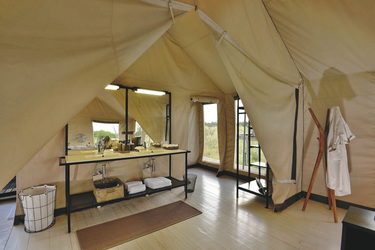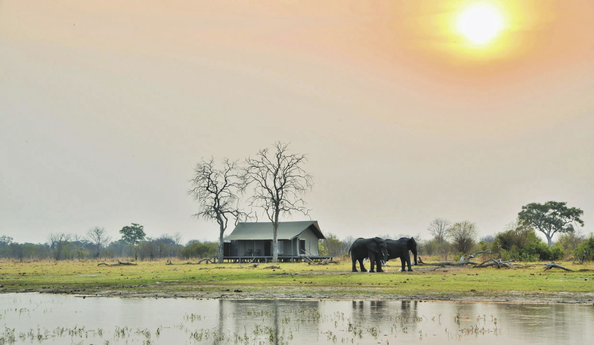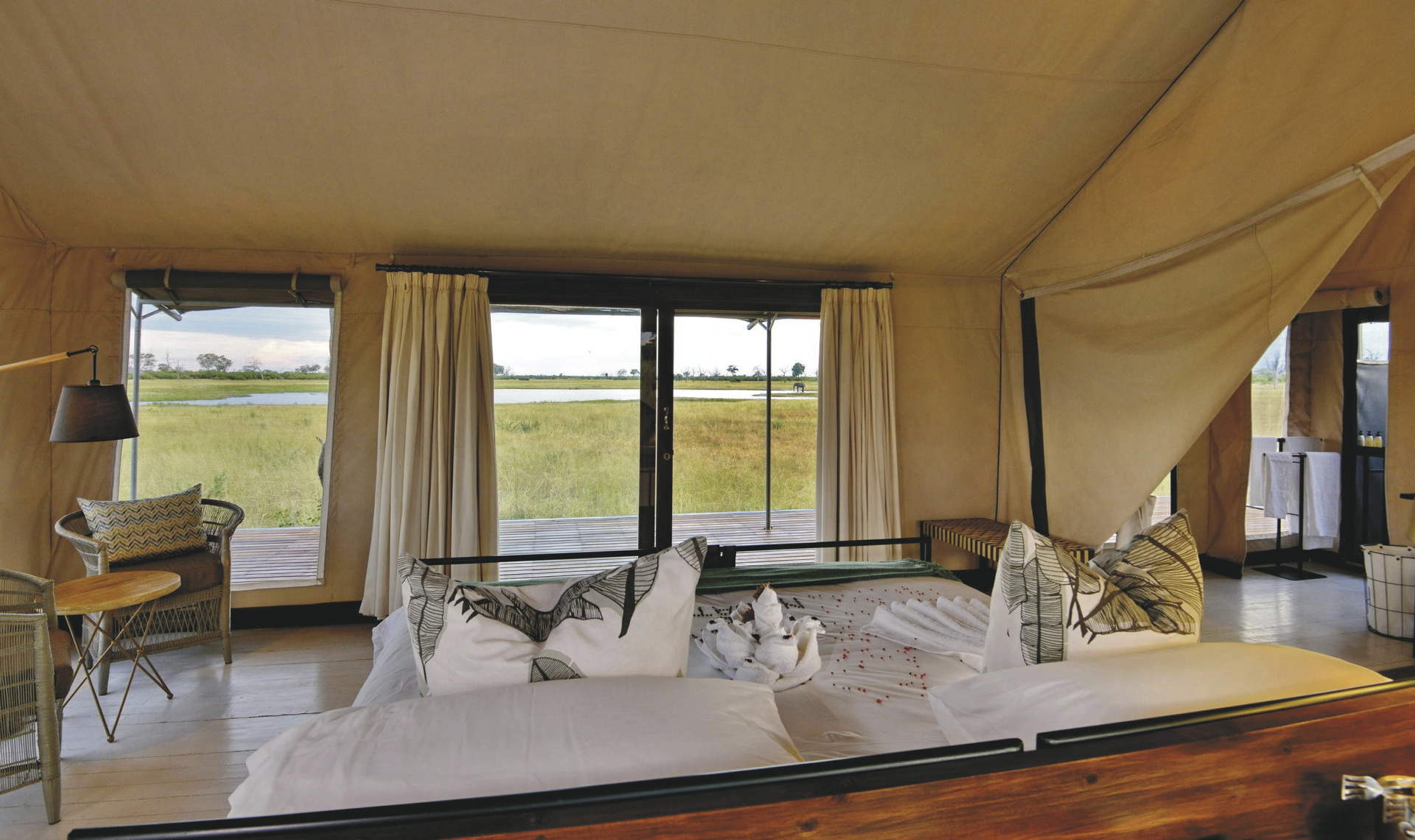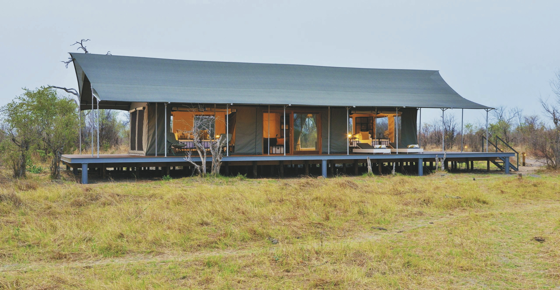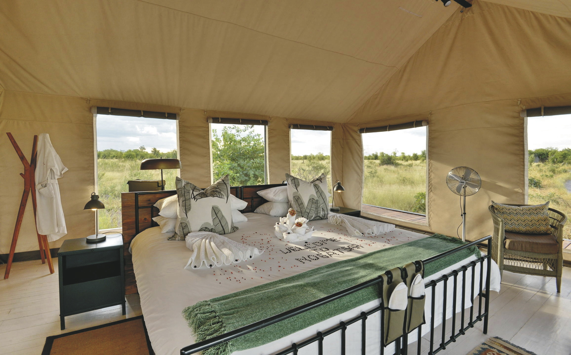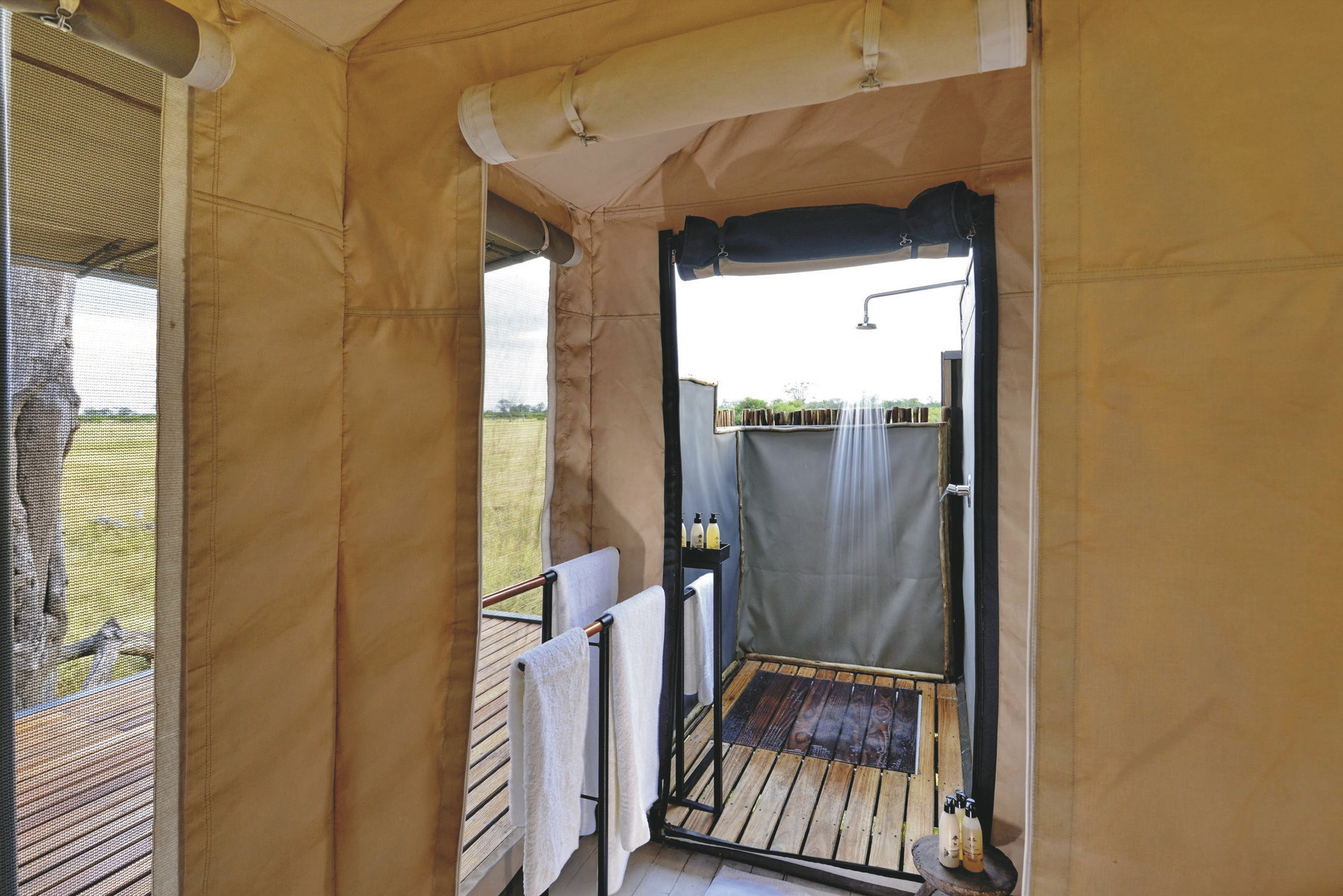 Die zehn geräumigen Safarizelte und zwei Familienzelte stehen auf erhöhten Holzplattformen und verfügen alle über große Betten, ein privates Bad mit WC und Außendusche sowie eine Terrasse mit Blick auf die Kwikamba Pfanne.