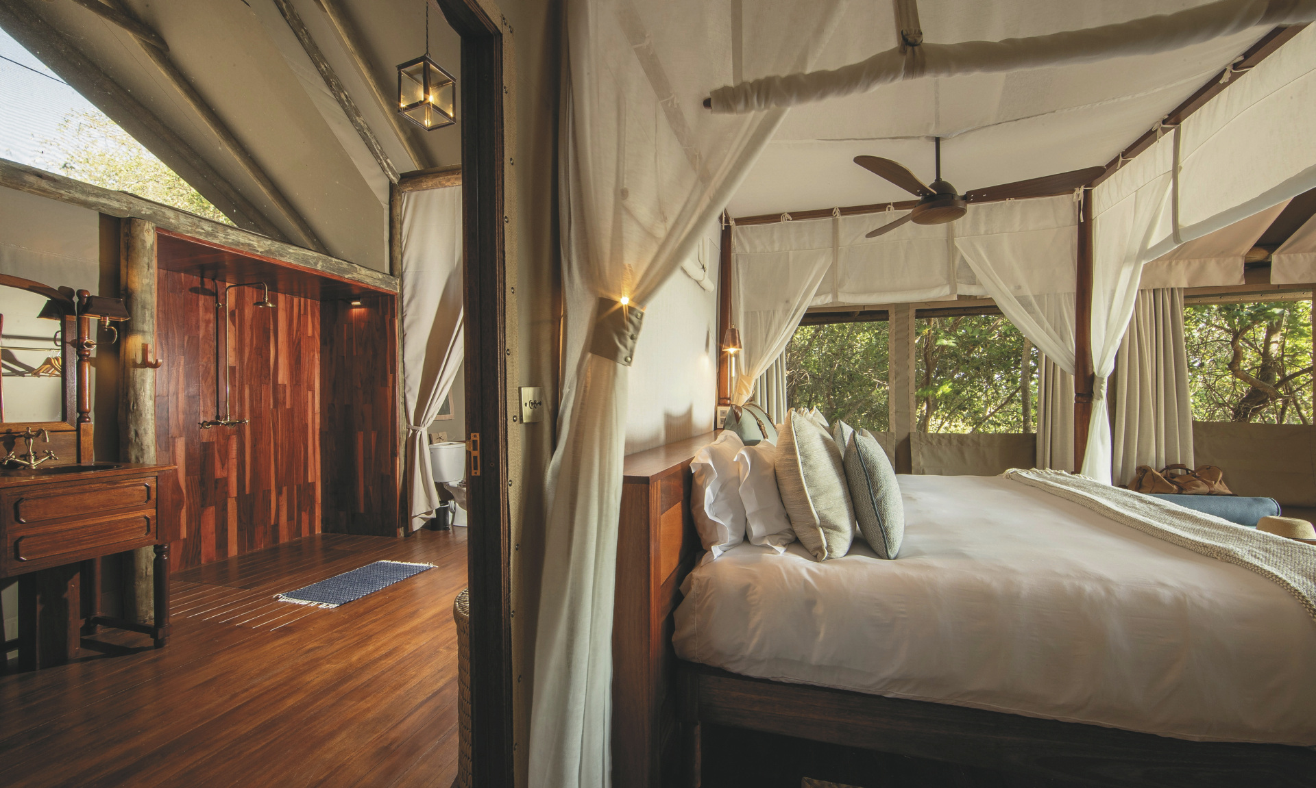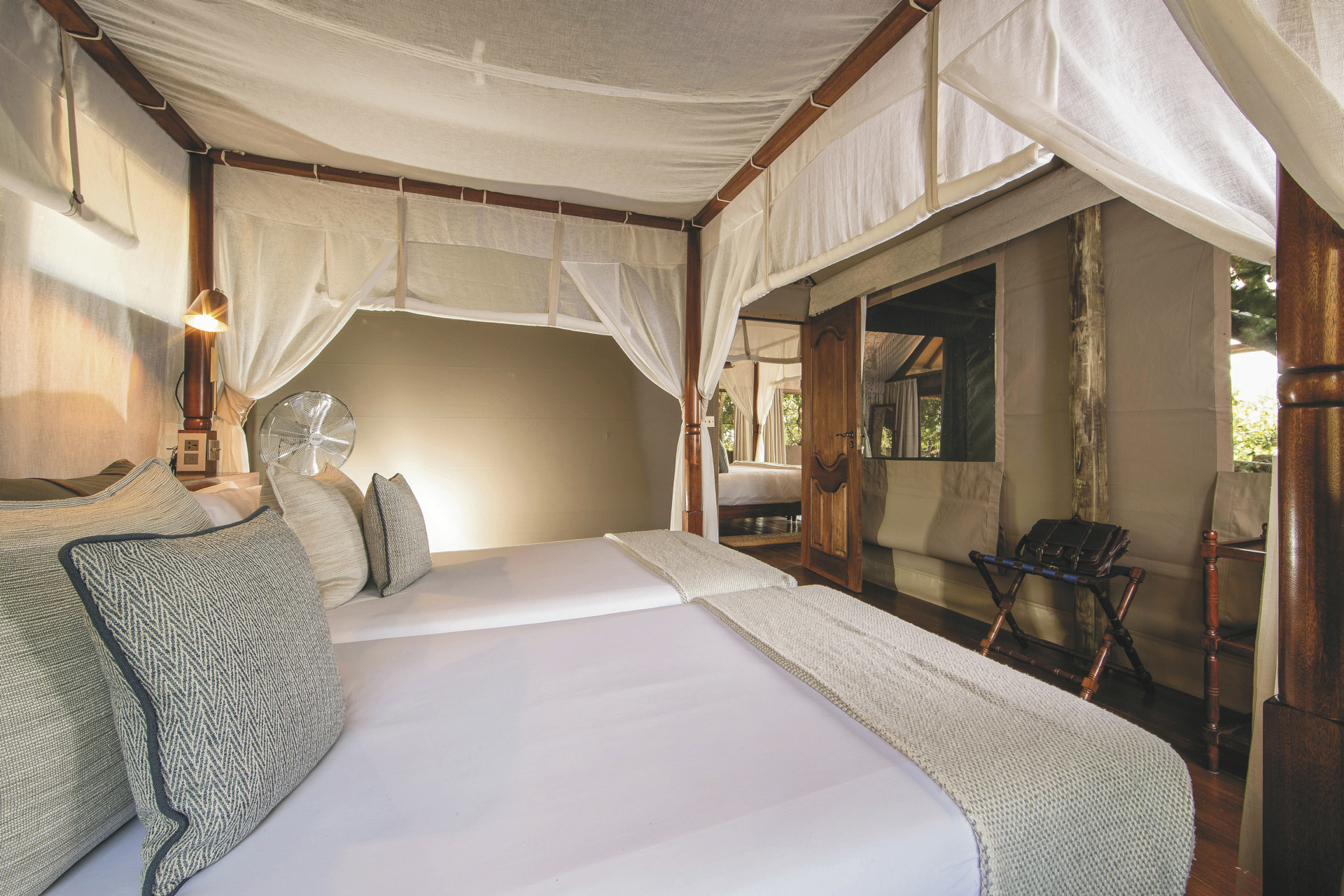 Der einzigartige Hauptbereich des Camps ist im „Baumhaus-Stil“ errichtet und besteht aus Lounges, Essbereichen (drinnen und draußen) und einem Feuerdeck - alles mit herrlichem Blick auf eine permanente Lagune und im Schatten von Ebenholz- und Mangostanbäumen. Die Zelte und der Hauptbereich bieten ein luxuriöses Erlebnis mit einem Hauch von historischem Charme. Der Pool bietet eine optimale Erfrischungsmöglichkeit an heißen Tagen und an der Feuerstelle lässt sich am Abend der Tag unter dem funkelnden Sternenhimmel Revue passieren.Eingeschlossene Aktivitäten: Tag- und Nachtpirschfahrten, Buschwanderungen, Angeln, Mokoro- und Bootsfahrten.