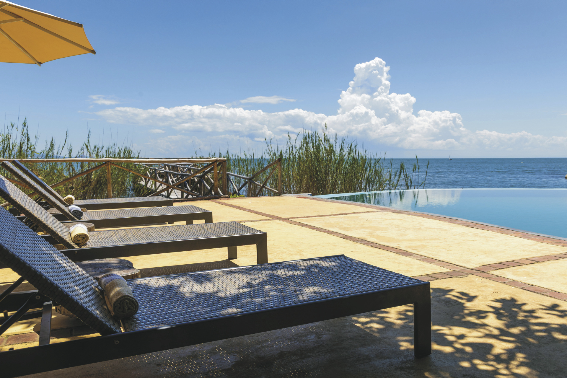 Die hübsche Lodge im Safaristil ist die einzige Unterkunft auf der kleinen Insel und bietet eine entspannte Atmosphäre. Im zentralen Bereich befinden sich gemütliche Sitzecken, das Restaurant, ein Spielezimmer und kostenloses WLAN. Näher am Wasser, mit traumhafter Aussicht, liegen der Pool, umgeben von einer Sonnenterrasse und die Poolbar. Besonders, von der Lage, sind auch die Sunset- Lounge und die Sunset-Terrasse, die nur über einen Steg zu erreichen ist. Im Spa können Sie sich von erfahrenen Kräften verwöhnen lassen. Eingeschlossene Aktivitäten: Kajaken, Schnorcheln, Wandern, Vogelbeobachtungen. Optional: Tauchen, Wasserski fahren, Bootstouren.