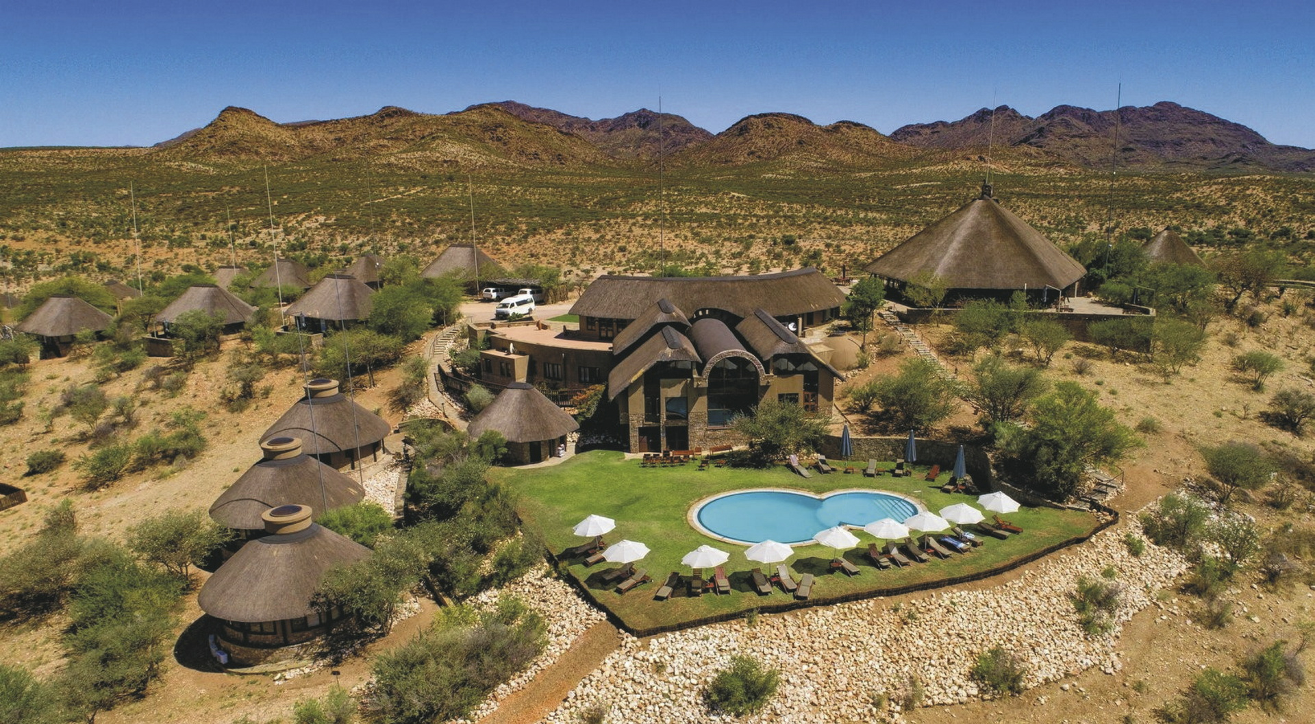 In einem 6.000 ha großen Wildschutzgebiet mit 25 Großwildarten auf einem Hochplateau gelegen. Windhoek ist ca. 30 km und der internationale Flughafen ca. 76 km entfernt.