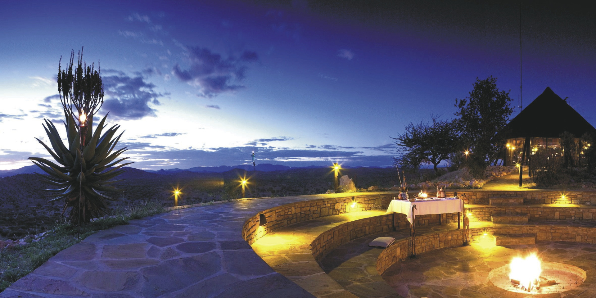 Im Hauptbereich befinden sich die Rezeption inklusive großem Souvenir-Angebot, das Hilltop-Restaurant, die Toko-Bar mit atemberaubendem 360-Grad-Rundblick sowie Terrassen mit spektakulärer Aussicht. Der Feuerzirkel lädt am Lagerfeuer zu feinen Getränken unterm bezaubernden Sternenhimmel ein. Genießen Sie die exquisite Küche und einen außergewöhnlichen Service. Eingeschlossen ist die Nutzung des einzigartigen Wellnesscenters mit beheiztem Innenpool, Grottensauna, Fitness- und Entspannungsbereich. Am Außenpool genießen Sie den traumhaften Panoramablick. WLAN steht kostenfrei zur Verfügung. Optionale Aktivitäten: Pirschfahrten, geführte oder individuelle Wanderungen, sowie eine Vielzahl von Wellnessanwendungen. Außerdem werden auch Massagen in freier Natur angeboten.