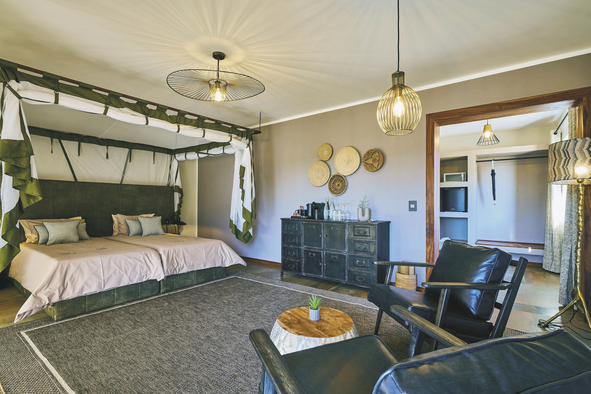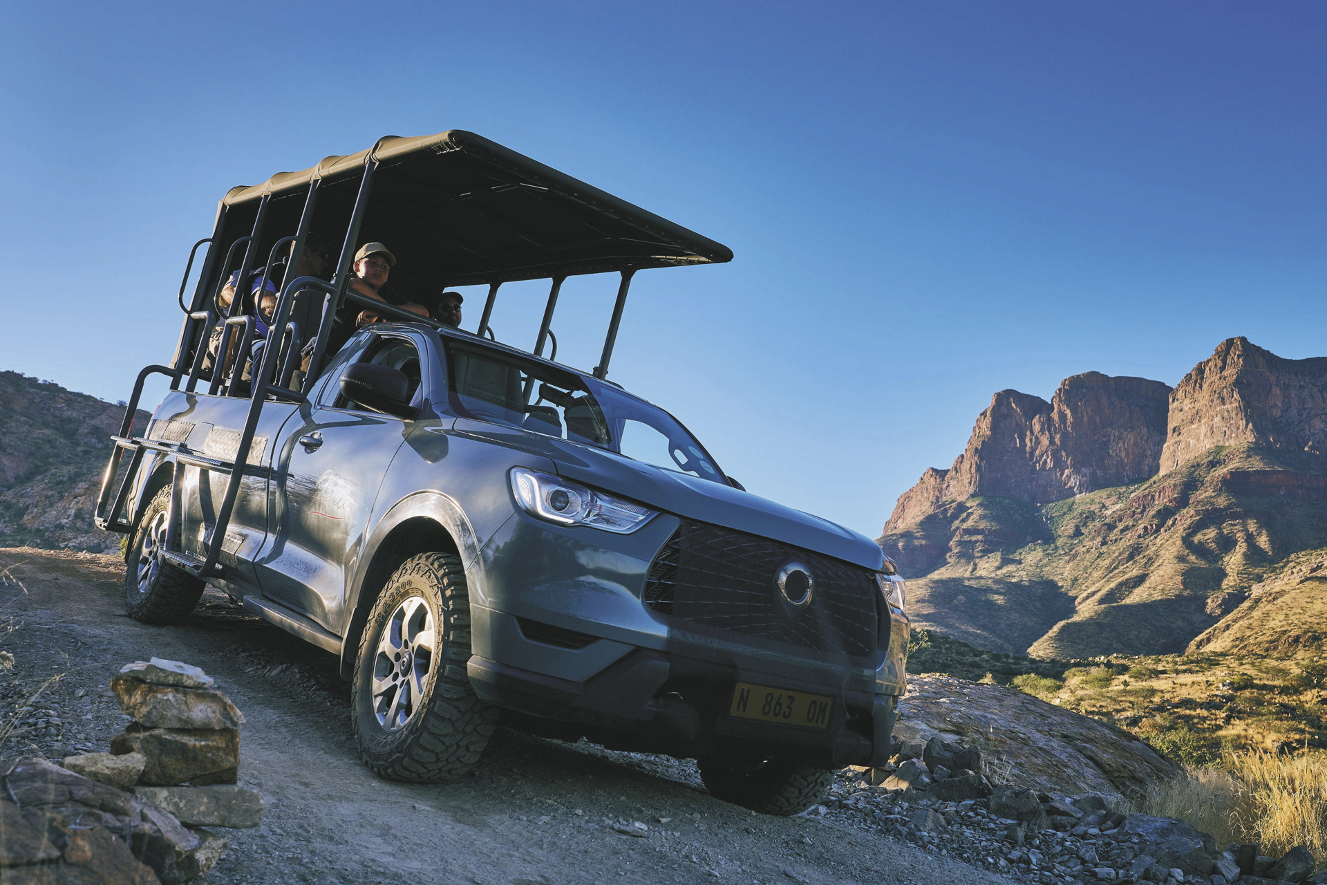 Die Lodge liegt dem höchsten Gipfel des Erongogebirges zu Füßen. Spektakuläre Sonnenuntergänge lassen den Berg in fantastischem roten Licht erscheinen. Im Haupthaus befinden sich das Restaurant und ein kombinierter Lounge-/Barbereich mit Kamin und kostenlosem WLAN. Die Terrasse bietet ein großartiges Panorama und Blick auf das nahe Wasserloch. Auf der Sonnenterrasse am Pool können Sie abschalten und entspannen. Am Abend lässt es sich an der flackernden Feuerstelle gut über die Ereignisse des Tages austauschen. Philipps Cave mit seinen Felsmalereien und die Granitformationen von Bulls Party befinden sich gleich auf der Nachbarfarm. Optionale Aktivitäten: geführte Wanderungen, markierte Wanderwege, Panoramafahrten, Besuch der Felsmalereien, Mountain-Bike Verleih.