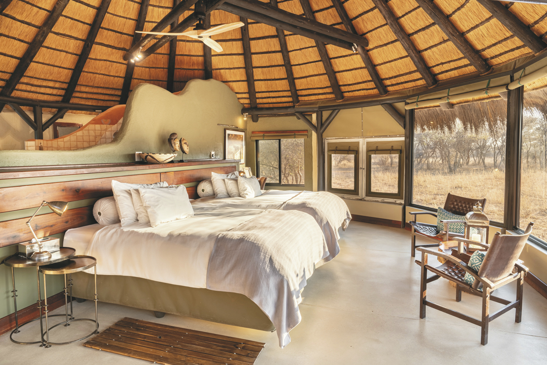 Es gibt 9 luxuriöse Chalets im afrikanischen Stil in Erdtönen gehalten mit tollem Blick über die Landschaft und modernen Badezimmern. Die große Fensterfront vor dem Bett kann komplett geöffnet werden und erlaubt ein großartiges Gefühl von Naturverbundenheit. Das Besondere ist die Sala, nur wenige Schritte vom Schlafzimmer entfernt. Eine offene Lounge mit toller Aussicht, gemütlichen Liegesesseln, Minibar und Tee-/Kaffeezubereiter. Vor jedem Chalet befindet sich eine Vogelfutter- und badestelle, die rege von den gefiederten Bewohnern und manchmal auch von vorwitzigen Warzenschweinen genutzt wird und tolle Beobachtungen bieten.