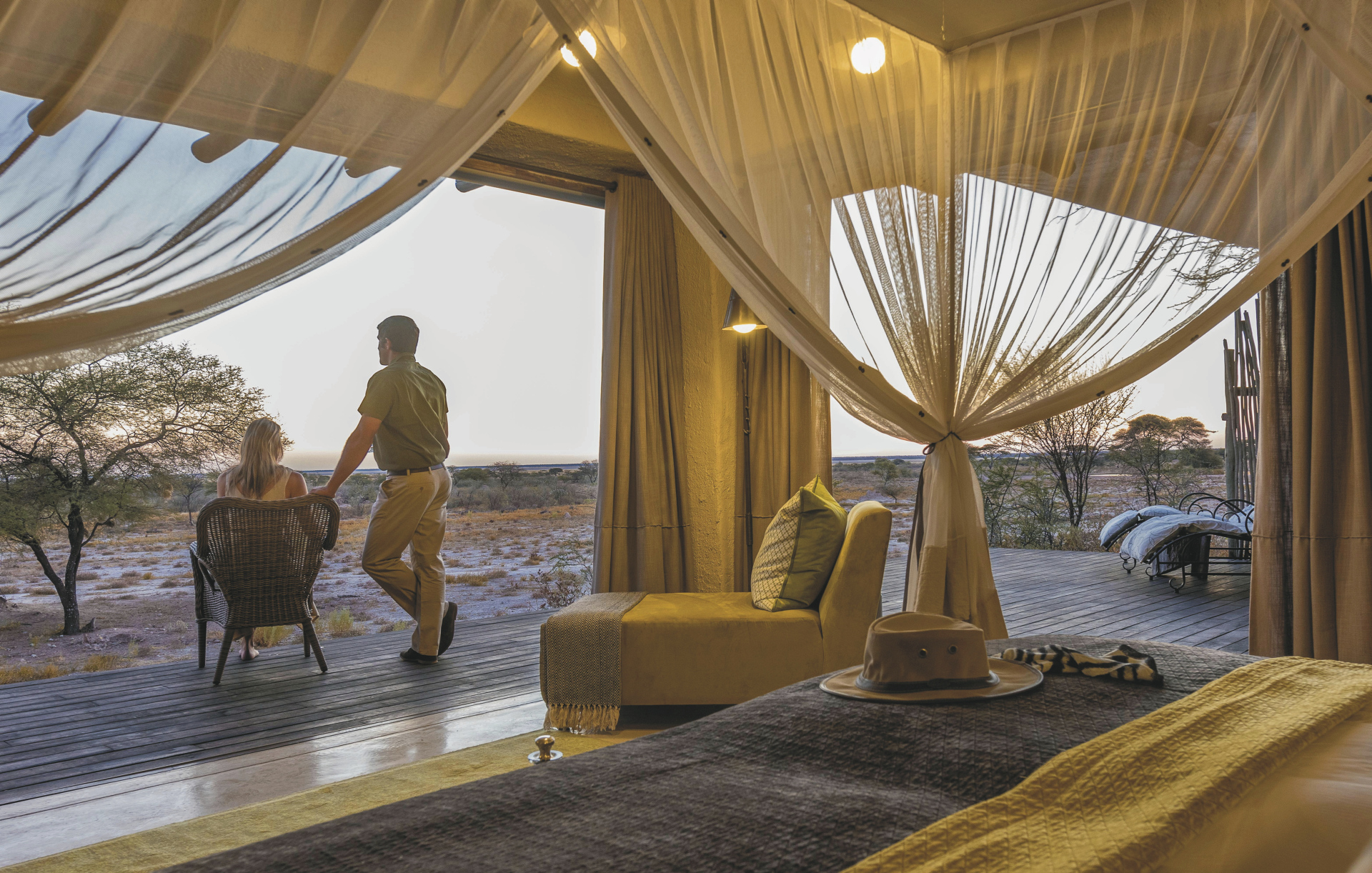 Die 11 Bush-Suiten und die Honeymoon-Suite reihen sich rechts und links an das Hauptgebäude und bieten größtmögliche Privatsphäre. Die Suiten verfügen über ein Bad mit Innen- und Außendusche; Safe, Minibar, Klimaanlage, Moskitonetz, Tee-/Kaffeezubereiter, Fön, Telefon, Kamin, kostenloses WLAN und eine eigene Terrasse. Die Honeymoon-Suite verfügt zusätzlich über eine Lounge mit TV und eine tolle Außenbadewanne. Der besondere Clou aber ist ein privater, holzbefeuerter Whirlpool auf der Terrasse. Die Sultan-Suite liegt in der oberen Etage des Hauptgebäudes, hat zusätzlich einen großzügigen Lounge-Bereich und eine tolle Aussichtsterrasse, anstatt einer Außendusche erwartet Sie hier eine herrliche Badewanne. Alle Suiten blicken auf die Wasserstelle und die Fischer-Pfanne.