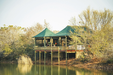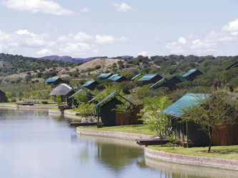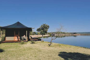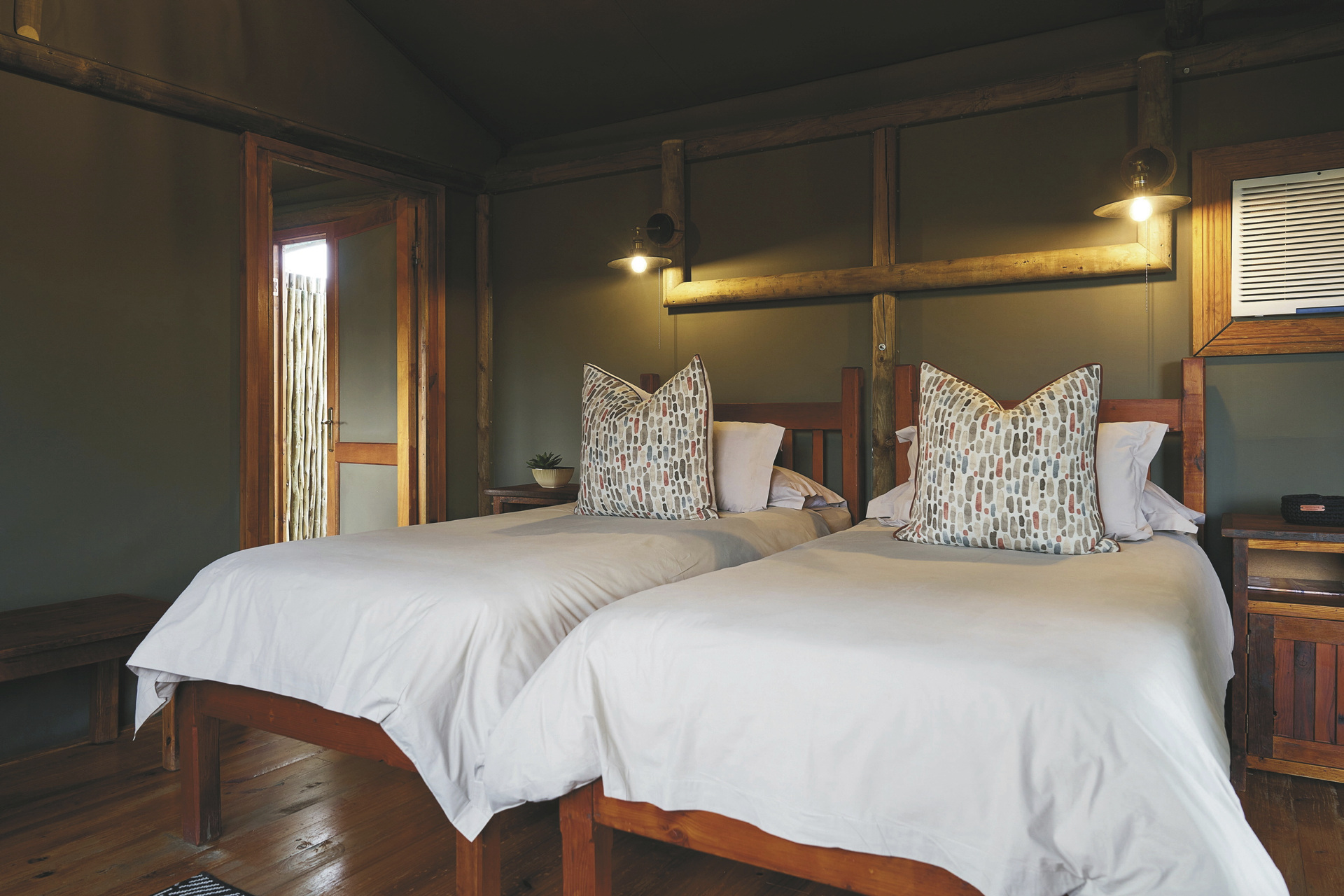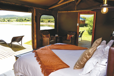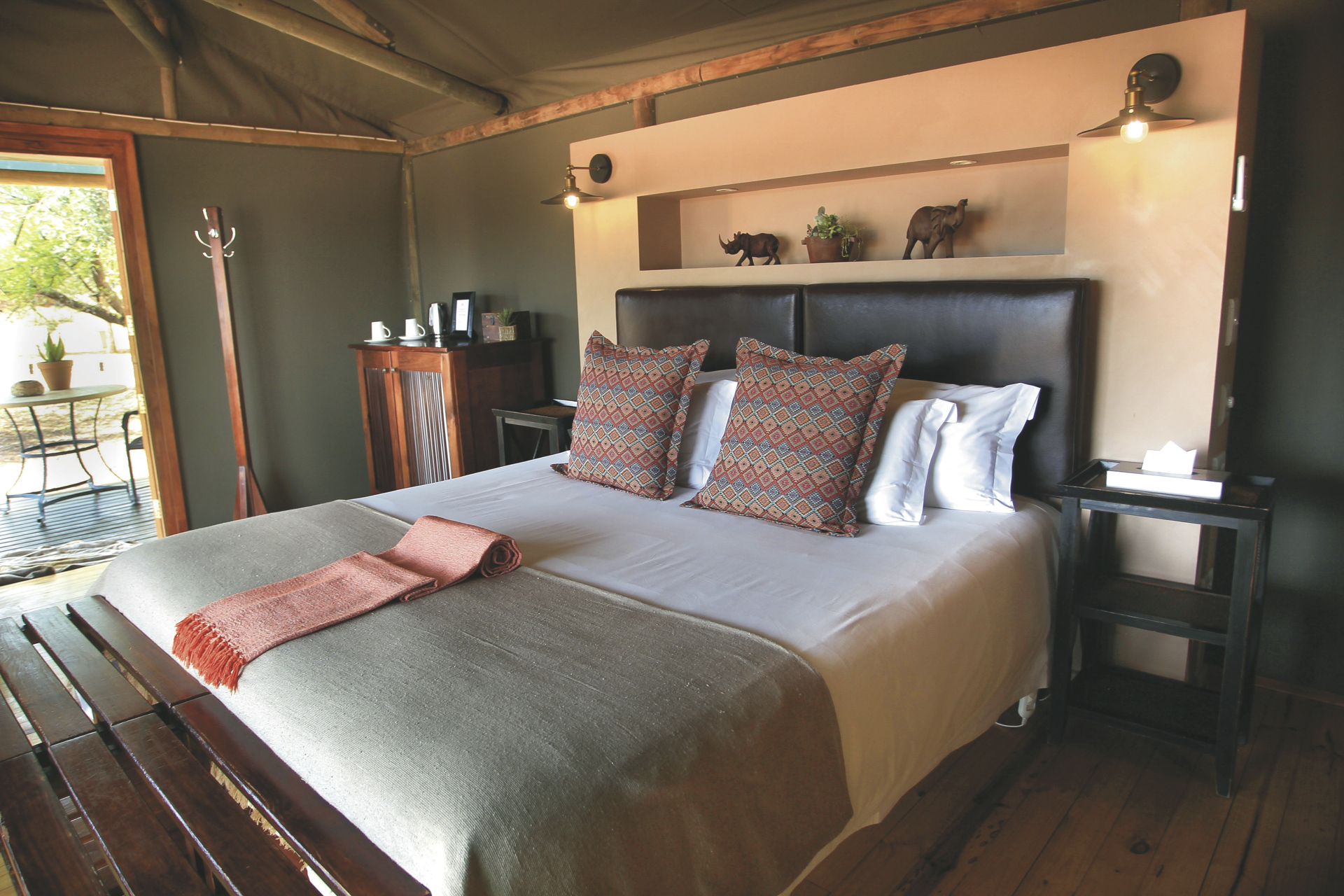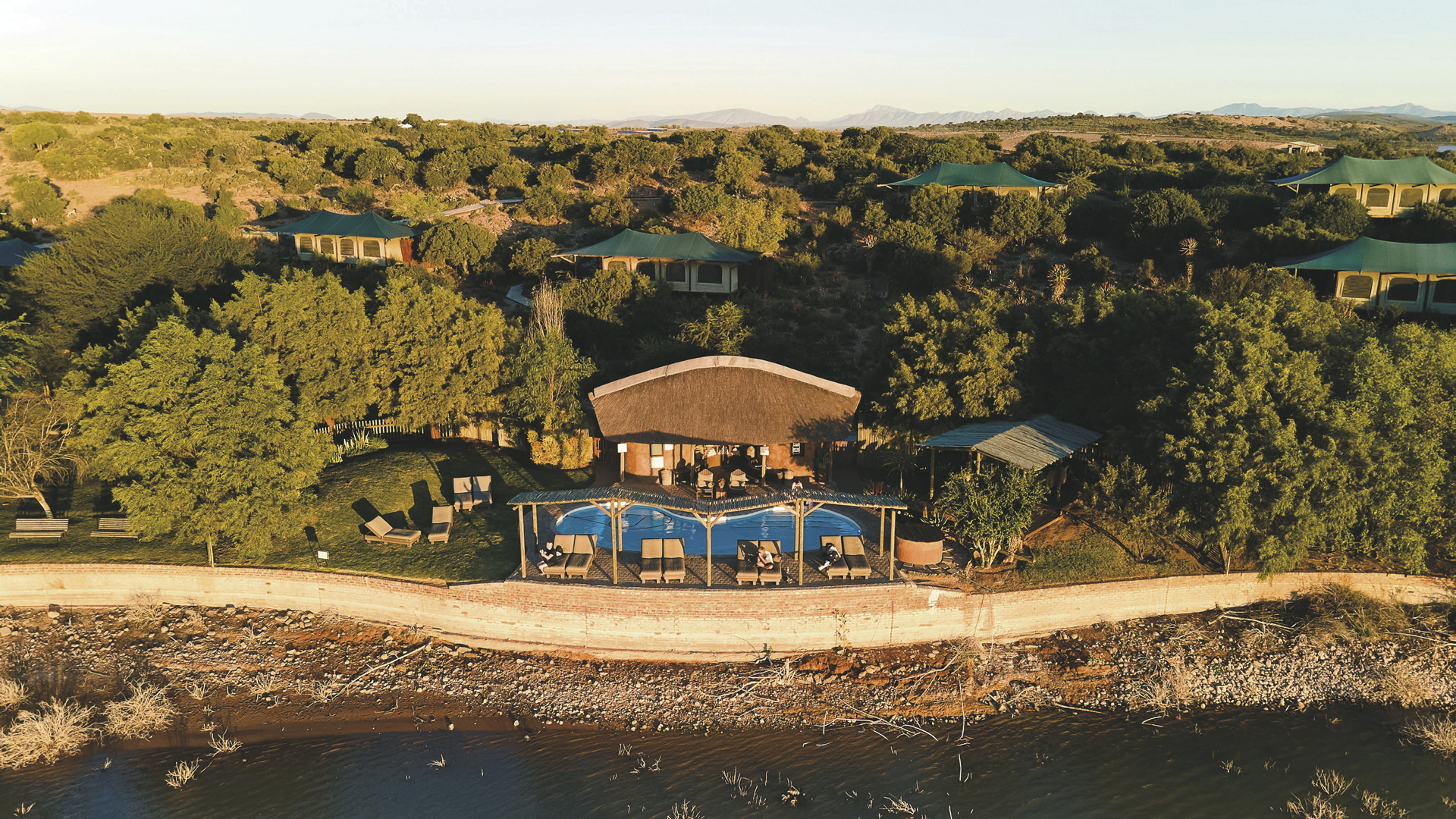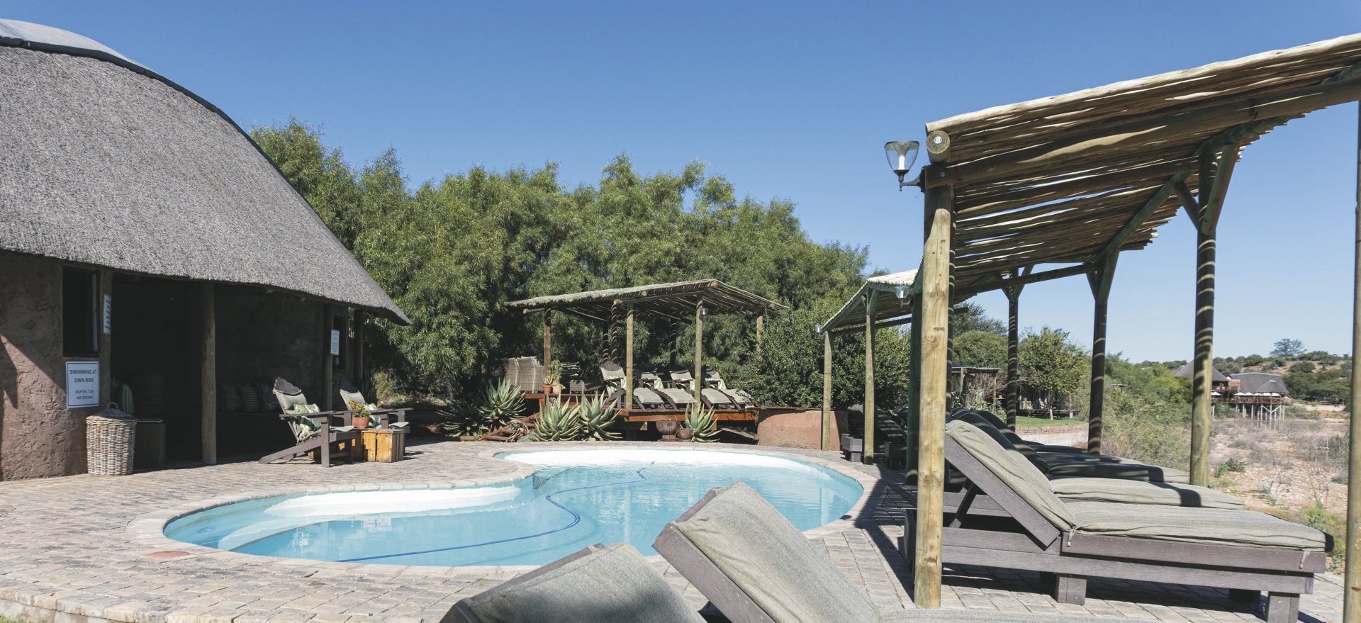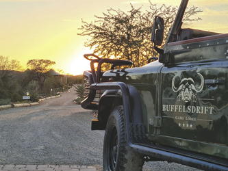 Die gemütliche, reetgedeckte Hauptlodge liegt direkt am Damm und bietet von der großen, überdachten Terrasse einen schönen Blick. Außerdem finden Sie hier eine gemütliche Lounge mit Kamin und einen kleinen Shop. Etwas abseits liegt der Spa, wo Sie eine Behandlung auf der Terrasse erhalten können. Der Pool und die Sonnenterrasse befinden sich zwischen den Superior-Zelten direkt am Damm. Die auf der Lodge lebenden Löwen wurden in Gefangenschaft geboren und können in der Wildnis nicht überleben, da sie nie gelernt haben zu jagen. Es handelt sich dennoch um wilde Löwen, die vom Menschen nicht angefasst werden dürfen, auch nicht von den Wildhütern. Buffelsdrift wurde auch die Heimat von drei verwaisten Elefantenbabys, die mittlerweile ausgewachsen sind, aber ebenfalls nicht mehr ausgewildert werden können, sie kennen ihre Feinde nicht und sind nicht sozialverträglich mit anderen Elefanten. Die Lodge bietet viele optionale Aktivitäten an: Pirschfahrt, Nachtpirschfahrt, Begegnung mit den Elefanten, Geparden-Tracking, Besuch zur Fütterungszeit im Löwen-Schutzgebiet, geführte Wanderung zu den Felsmalereien, Erdmännchen-Safari.
