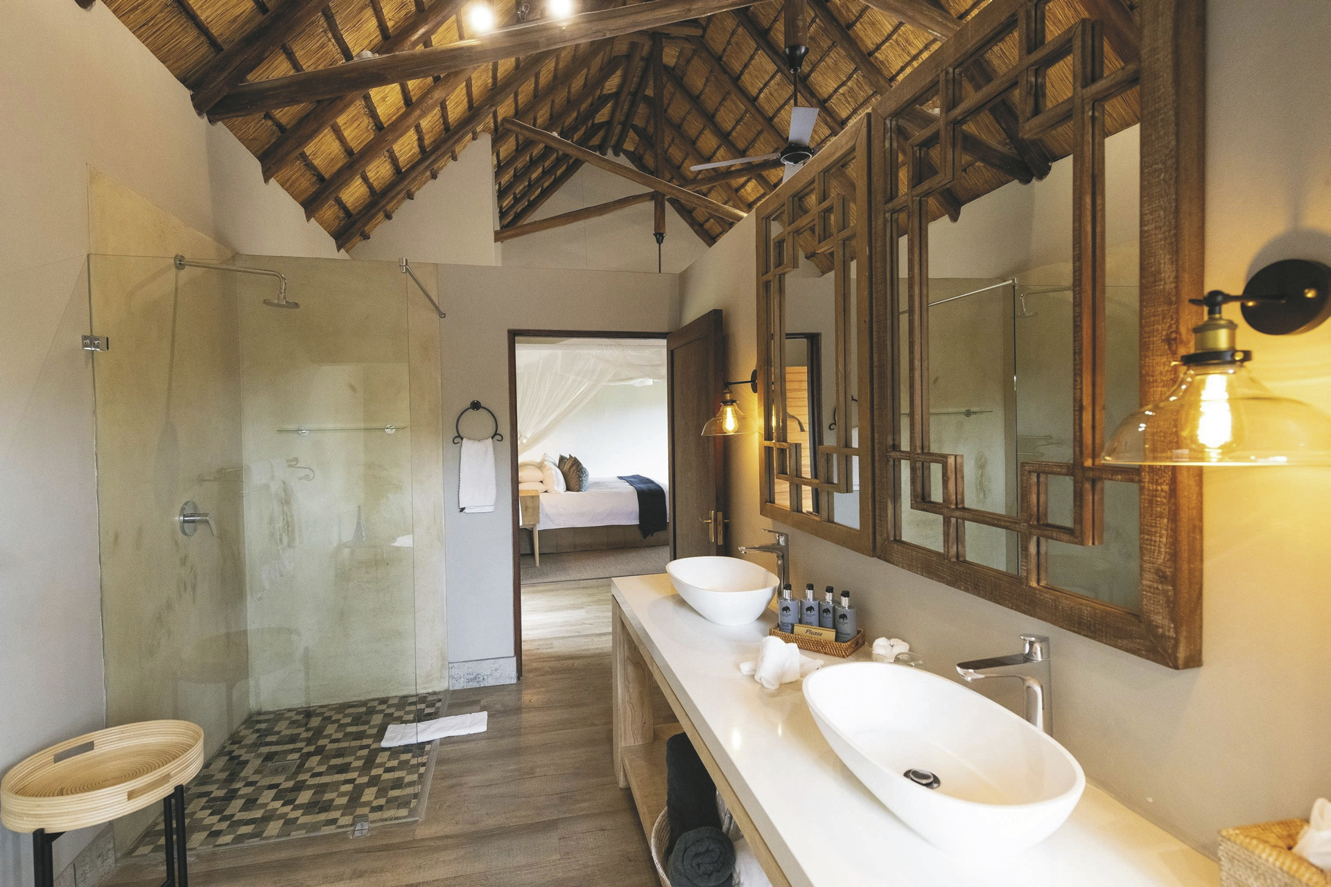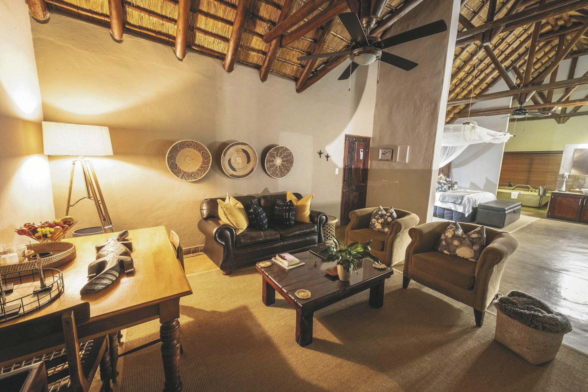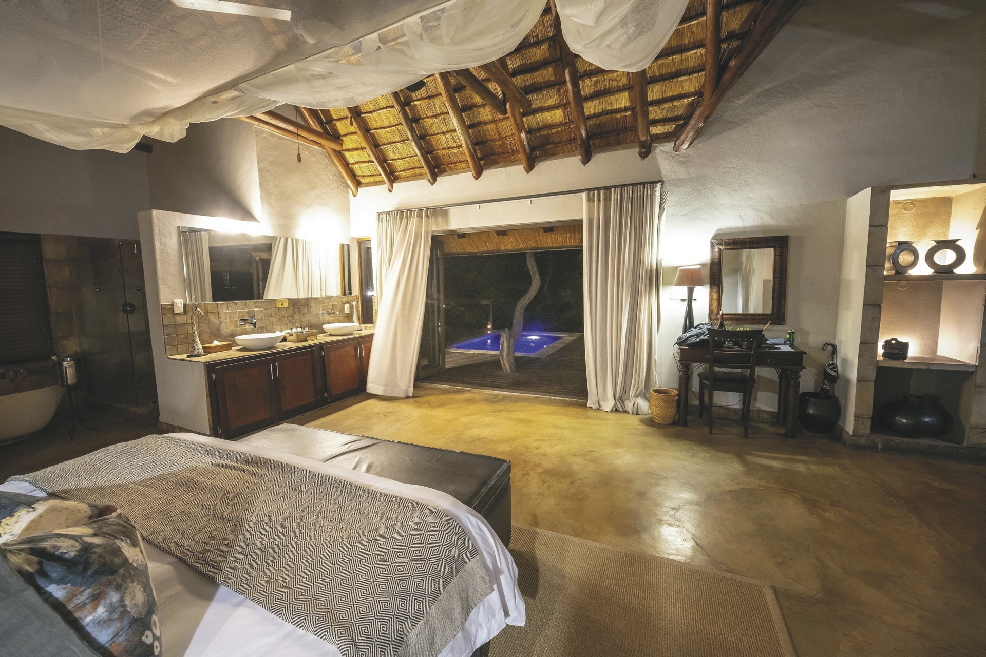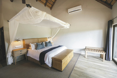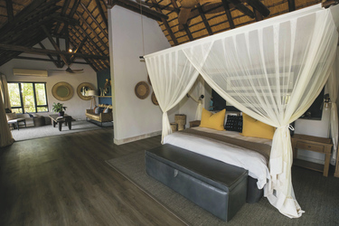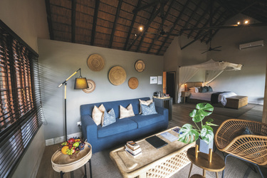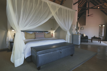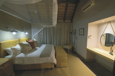 Die 5 geräumigen und rustikalen Rondavels verteilen sich im Garten, sie verströmen nicht nur durch das Strohdach und die runde Bauweise ein klassisches Busch-Ambiente. Auch die dunklen Holzmöbel und natürlichen und erdigen Farben der Einrichtung tragen dazu bei. Ausgestattet sind sie mit eigenem Bad, Klimaanlage, Ventilator, Safe, Tee-/Kaffeezubereiter, Minibar, Moskitonetz und kleiner Terrasse. Die 6 Luxus-Suiten haben eine frische Einrichtung, helles Holz und helle Farben dominieren das Bild. Sie geben den Blick auf das gut besuchte Wasserloch frei und verfügen zusätzlich über einen Loungebereich mit Kamin und eine Außendusche. Die Honeymoon-Suite, in abgeschiedener Lage, hat ein offenes Badezimmer mit einer Doppel-Außendusche, einer großen Lounge und einen privaten Plunge Pool. Eine Suite ist mit 2 Schlaf-und 2 Badezimmern für Familien mit Kindern bestens geeignet.