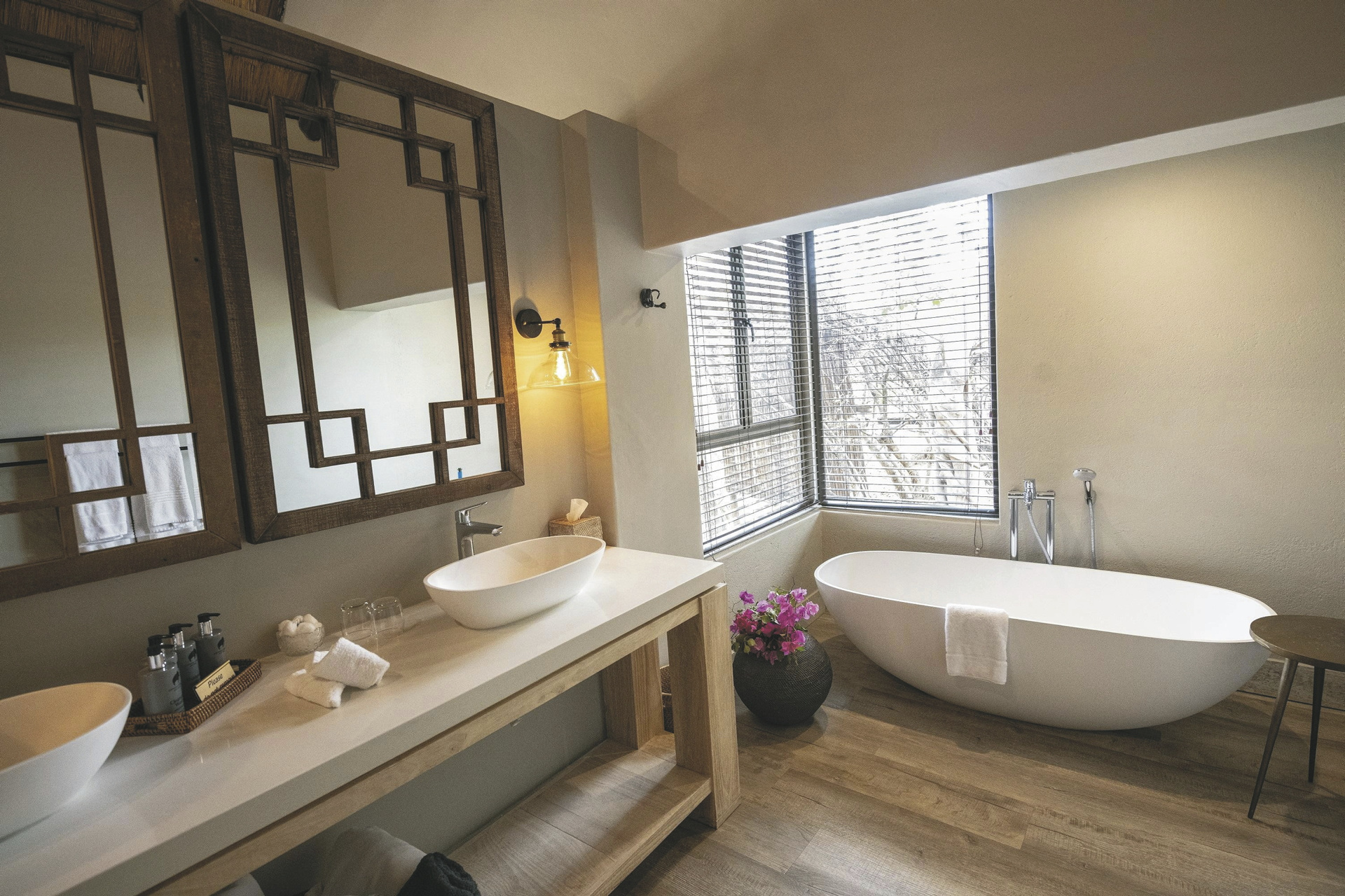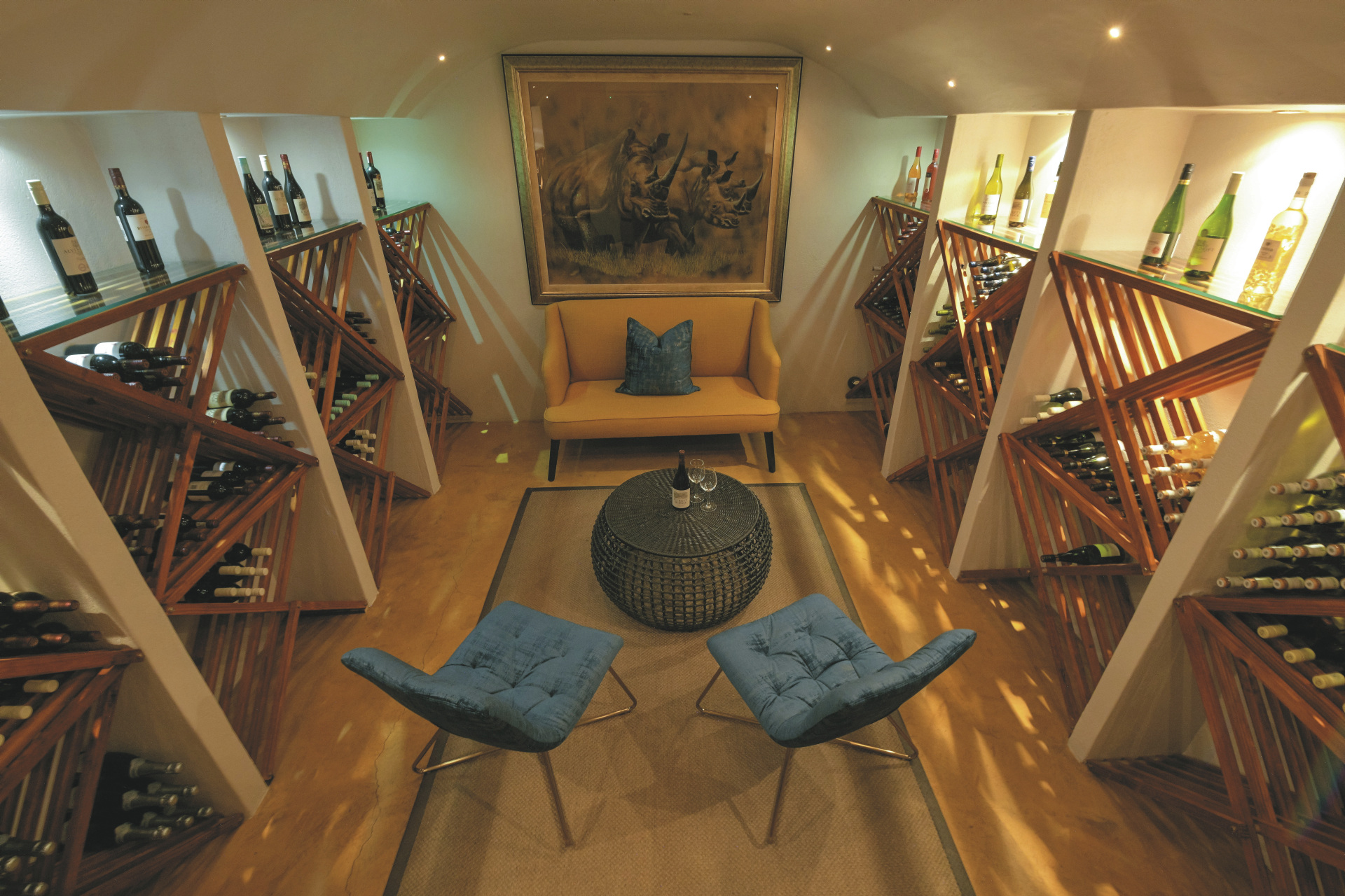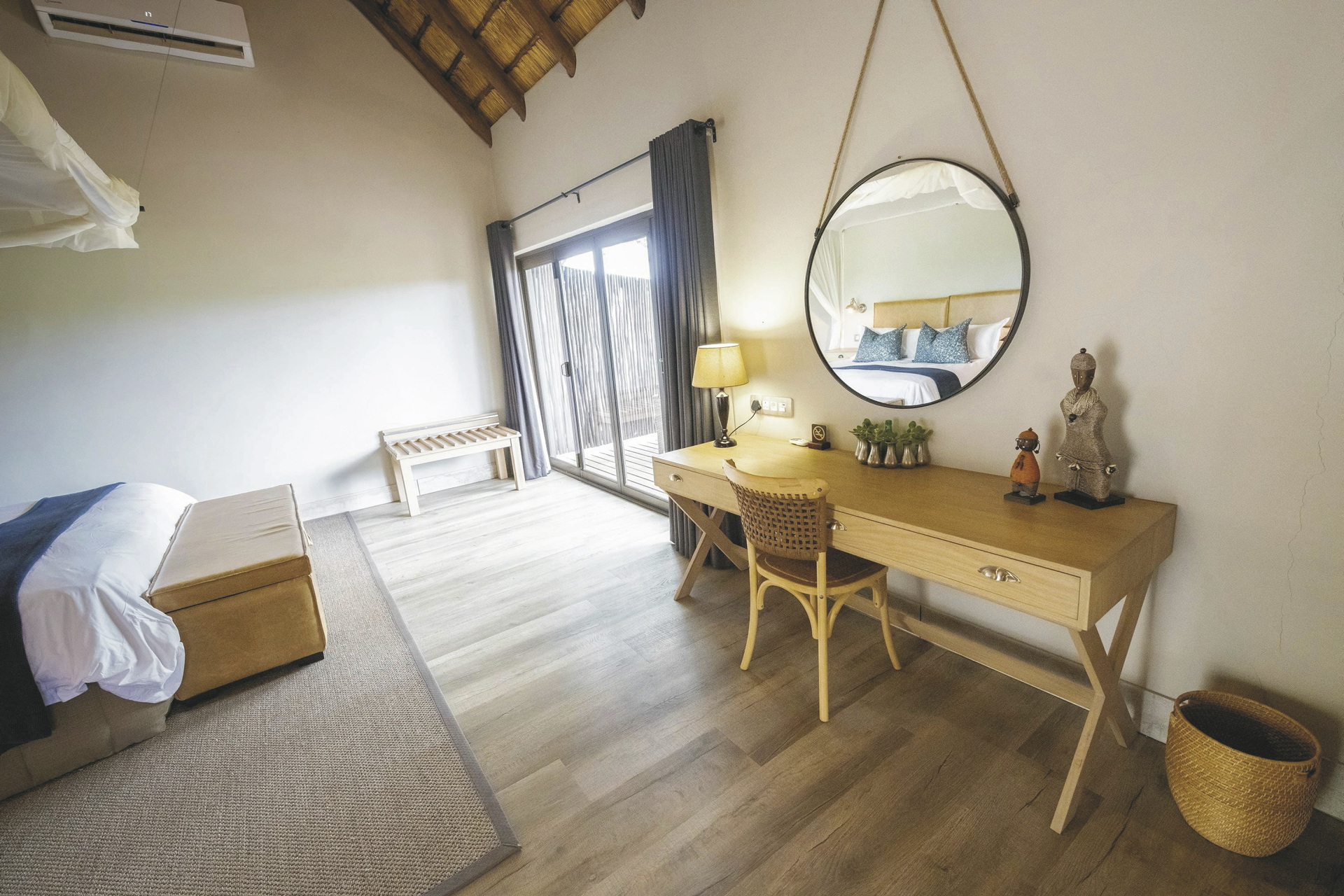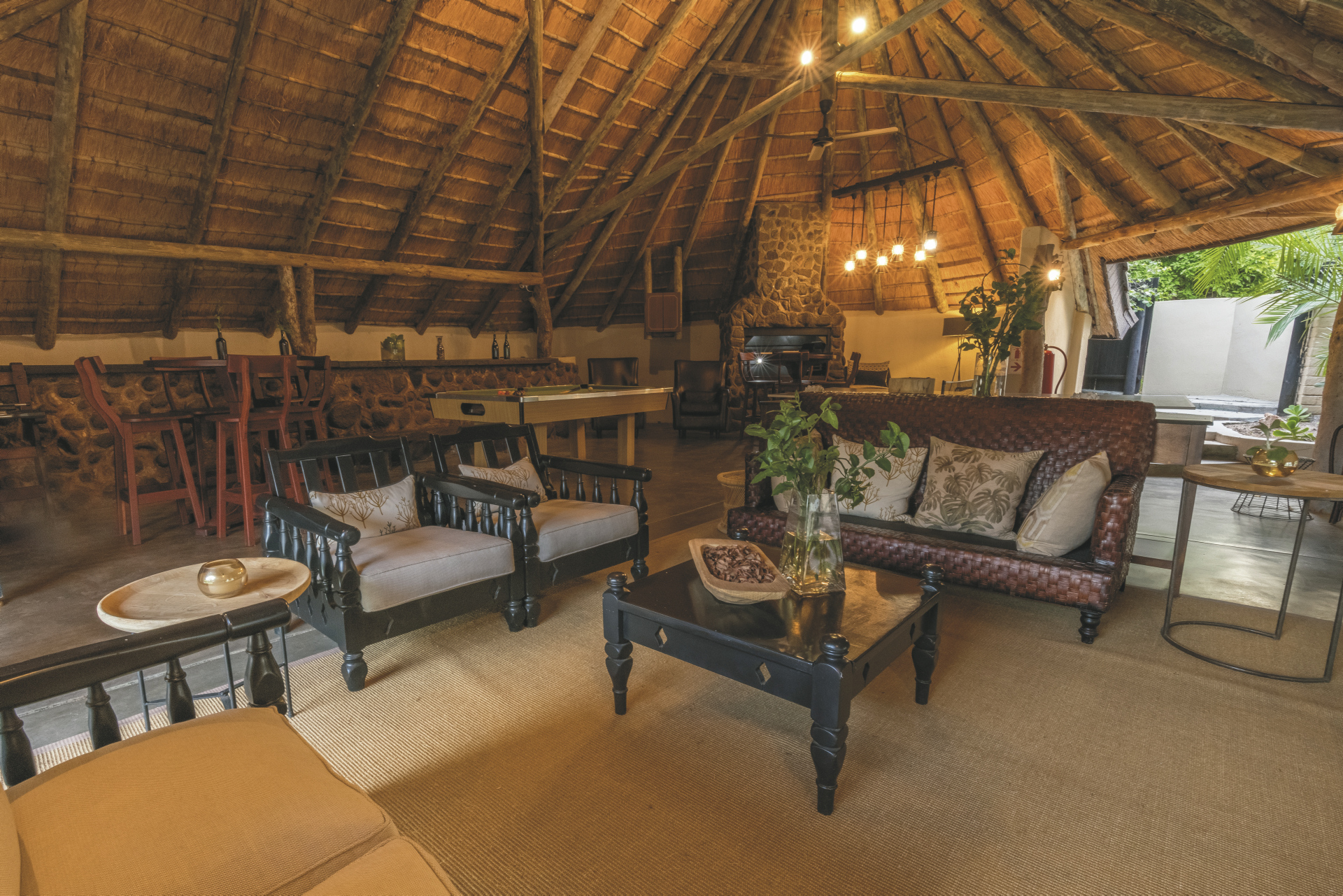 Die 5 geräumigen und rustikalen Rondavels verteilen sich im Garten, sie verströmen nicht nur durch das Strohdach und die runde Bauweise ein klassisches Busch-Ambiente. Auch die dunklen Holzmöbel und natürlichen und erdigen Farben der Einrichtung tragen dazu bei. Ausgestattet sind sie mit eigenem Bad, Klimaanlage, Ventilator, Safe, Tee-/Kaffeezubereiter, Minibar, Moskitonetz und kleiner Terrasse. Die 6 Luxus-Suiten haben eine frische Einrichtung, helles Holz und helle Farben dominieren das Bild. Sie geben den Blick auf das gut besuchte Wasserloch frei und verfügen zusätzlich über einen Loungebereich mit Kamin und eine Außendusche. Die Honeymoon-Suite, in abgeschiedener Lage, hat ein offenes Badezimmer mit einer Doppel-Außendusche, einer großen Lounge und einen privaten Plunge Pool. Eine Suite ist mit 2 Schlaf-und 2 Badezimmern für Familien mit Kindern bestens geeignet.