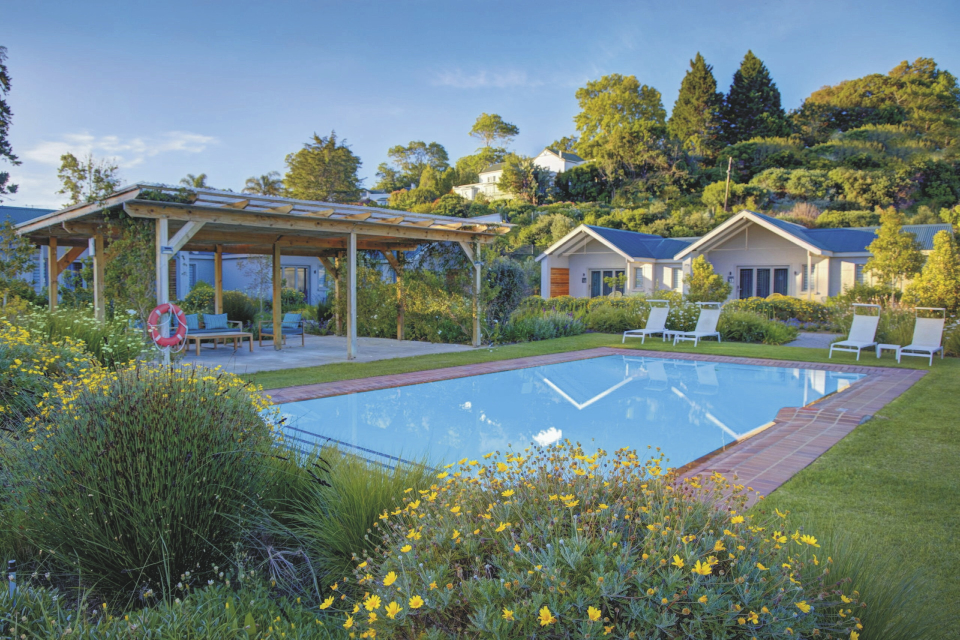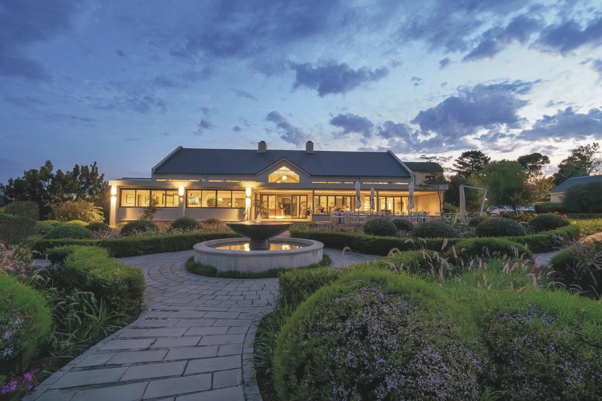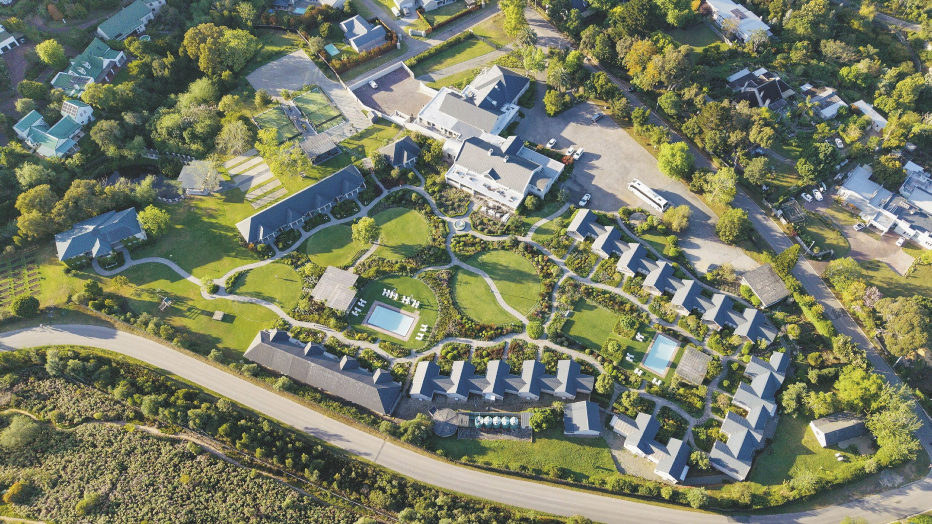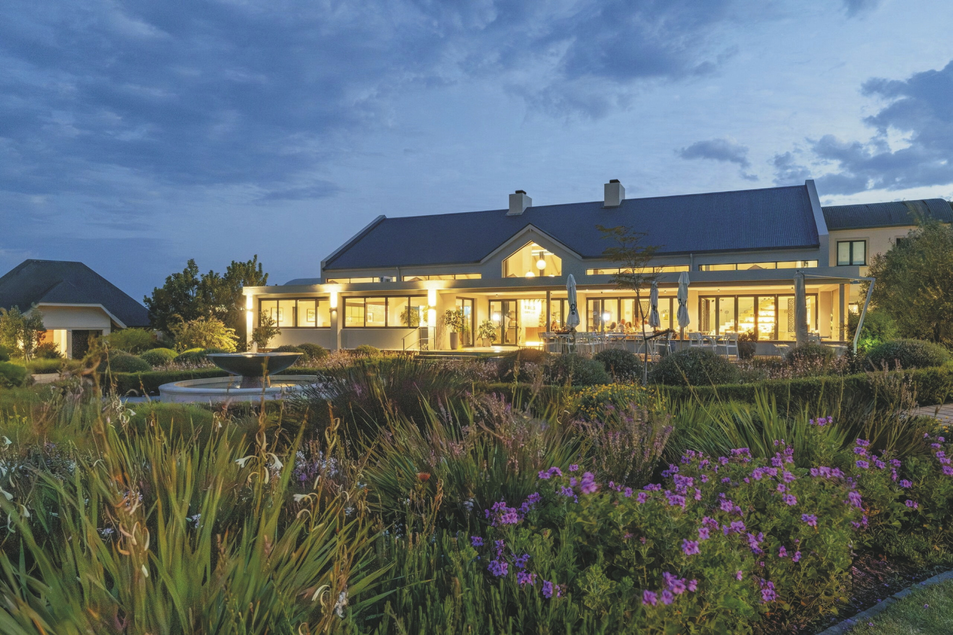 Das moderne Country Estate liegt in einer schönen, weitläufigen 3 Hektar großen Gartenanlage; bunte Blumen, Fynbos und Lavendel gemischt mit Gräser bilden das ganze Jahr hindurch einen blühenden Teppich. Die Suiten gruppieren sich um die 2 Pools und die Sonnenterrassen. Im Hauptbereich dominieren klare Linien, warmes Holz und große Fensterfronten, hier finden Sie das weitläufige Restaurant und den Barbereich, bei gutem Wetter können Sie draußen auf der Terrasse sitzen. Erlesene Weine, nicht nur aus Südafrika, stehen im Weinkeller zur Auswahl, dieser Bereich steht auch für ein privates, romantisches Abendessen zu besonderen Anlässen auf Anfrage zur Verfügung. Im Außenbereich warten ein Boule-Platz und zwei Padel-Plätze darauf bespielt zu werden. Wer die Umgebung gerne aktiv erkunden möchte sollte dem hauseigenen Fahrrad-Verleih einen Besuch abstatten.