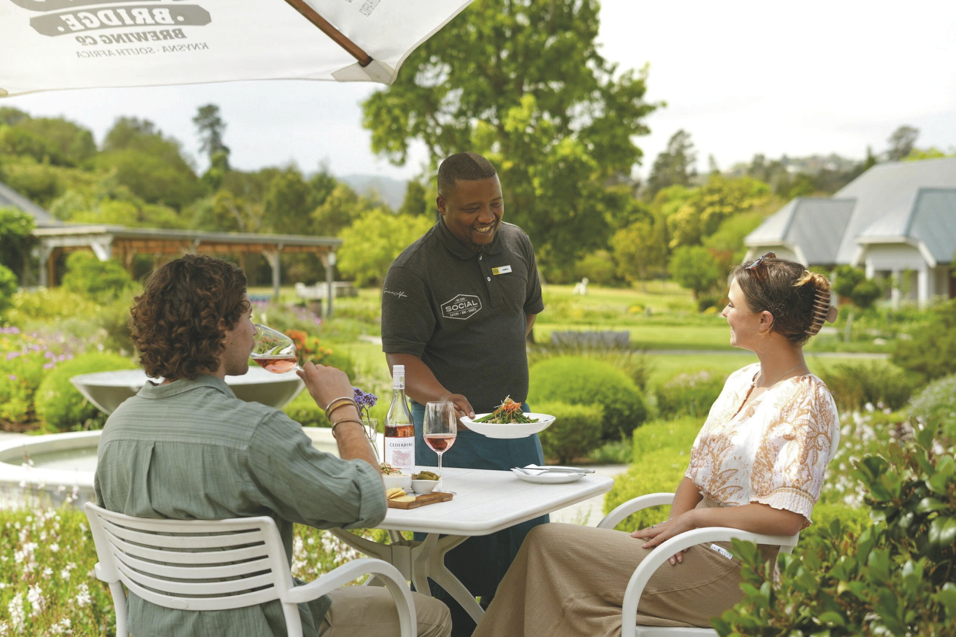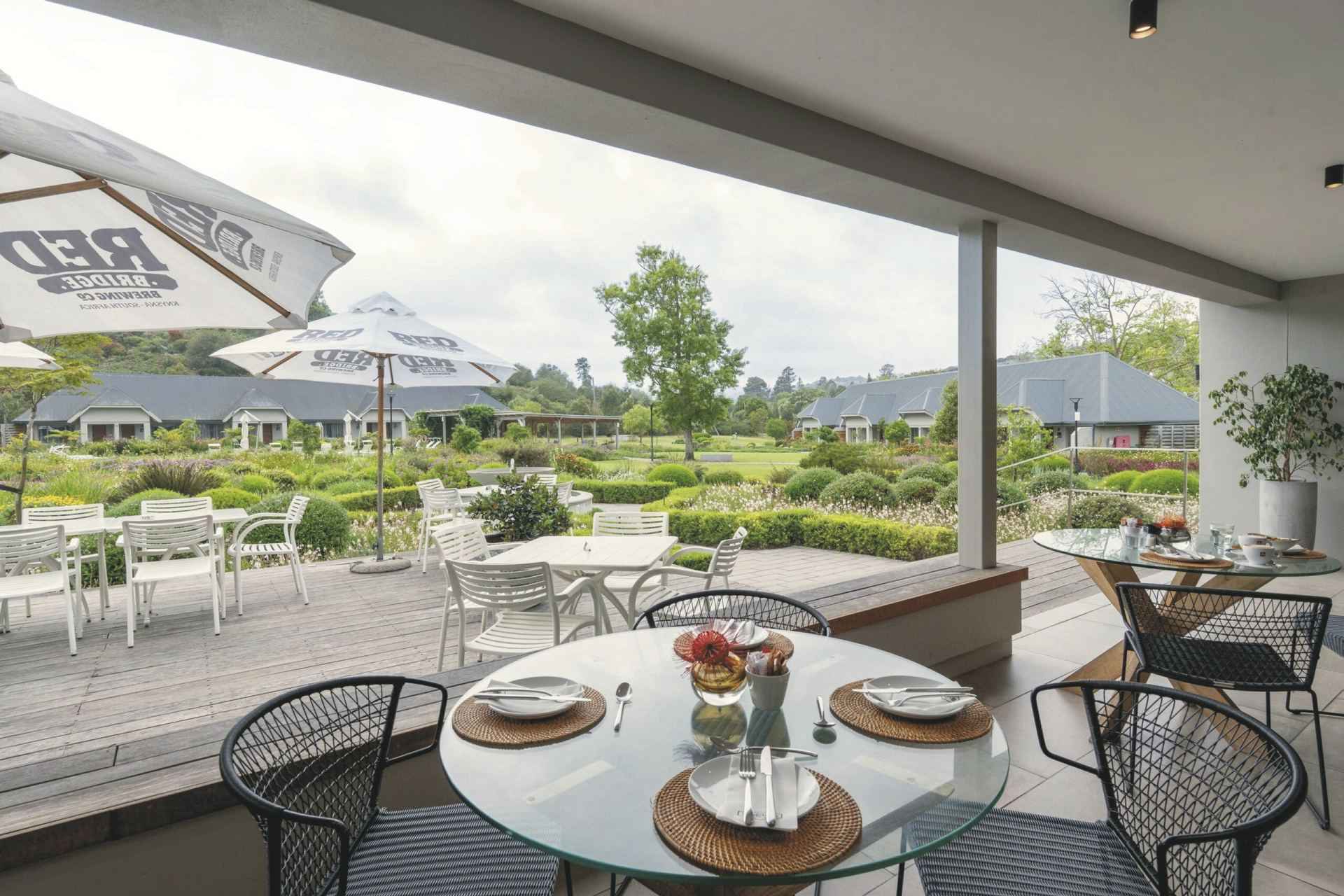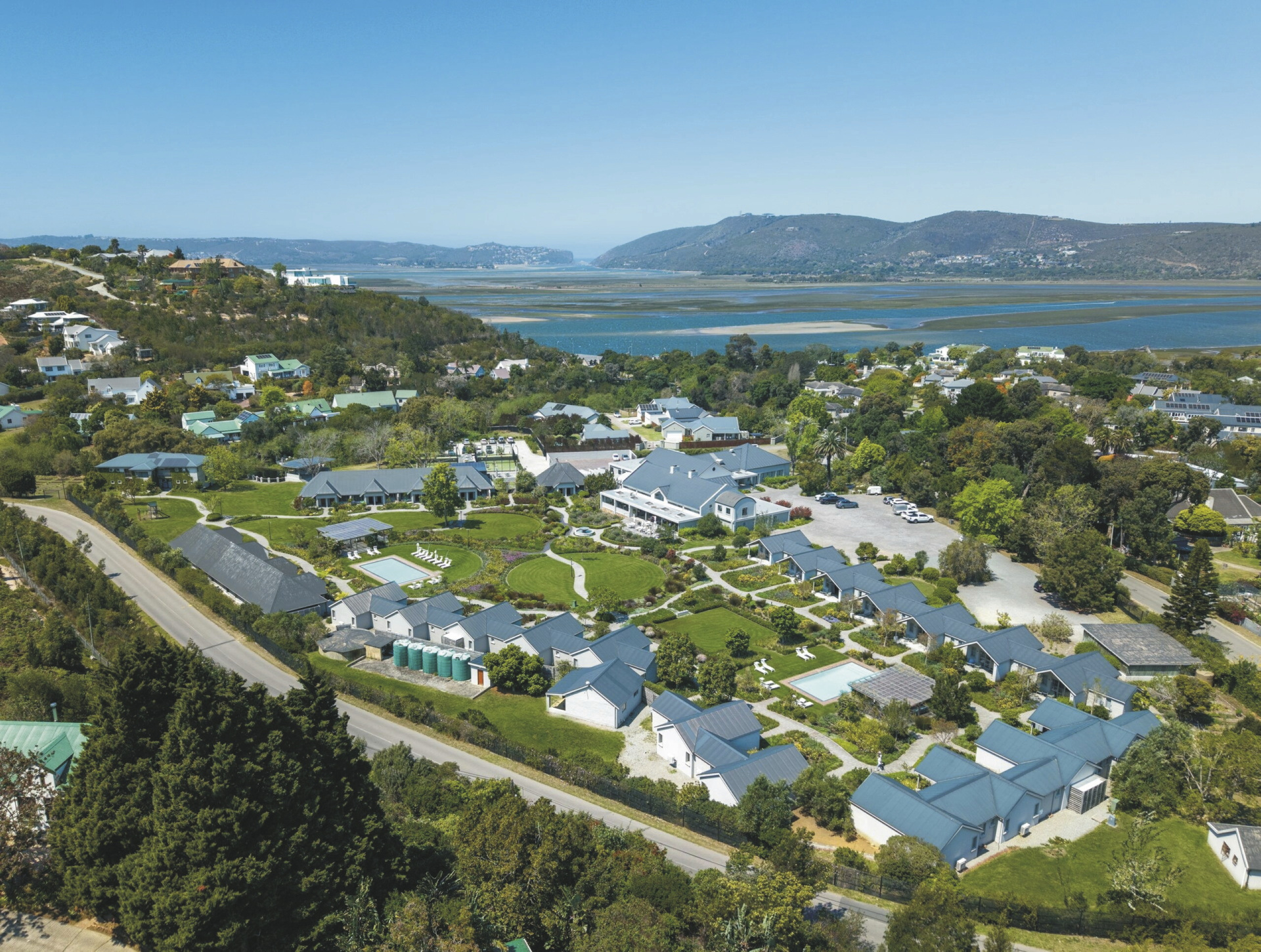 Das moderne Country Estate liegt in einer schönen, weitläufigen 3 Hektar großen Gartenanlage; bunte Blumen, Fynbos und Lavendel gemischt mit Gräser bilden das ganze Jahr hindurch einen blühenden Teppich. Die Suiten gruppieren sich um die 2 Pools und die Sonnenterrassen. Im Hauptbereich dominieren klare Linien, warmes Holz und große Fensterfronten, hier finden Sie das weitläufige Restaurant und den Barbereich, bei gutem Wetter können Sie draußen auf der Terrasse sitzen. Erlesene Weine, nicht nur aus Südafrika, stehen im Weinkeller zur Auswahl, dieser Bereich steht auch für ein privates, romantisches Abendessen zu besonderen Anlässen auf Anfrage zur Verfügung. Im Außenbereich warten ein Boule-Platz und zwei Padel-Plätze darauf bespielt zu werden. Wer die Umgebung gerne aktiv erkunden möchte sollte dem hauseigenen Fahrrad-Verleih einen Besuch abstatten.