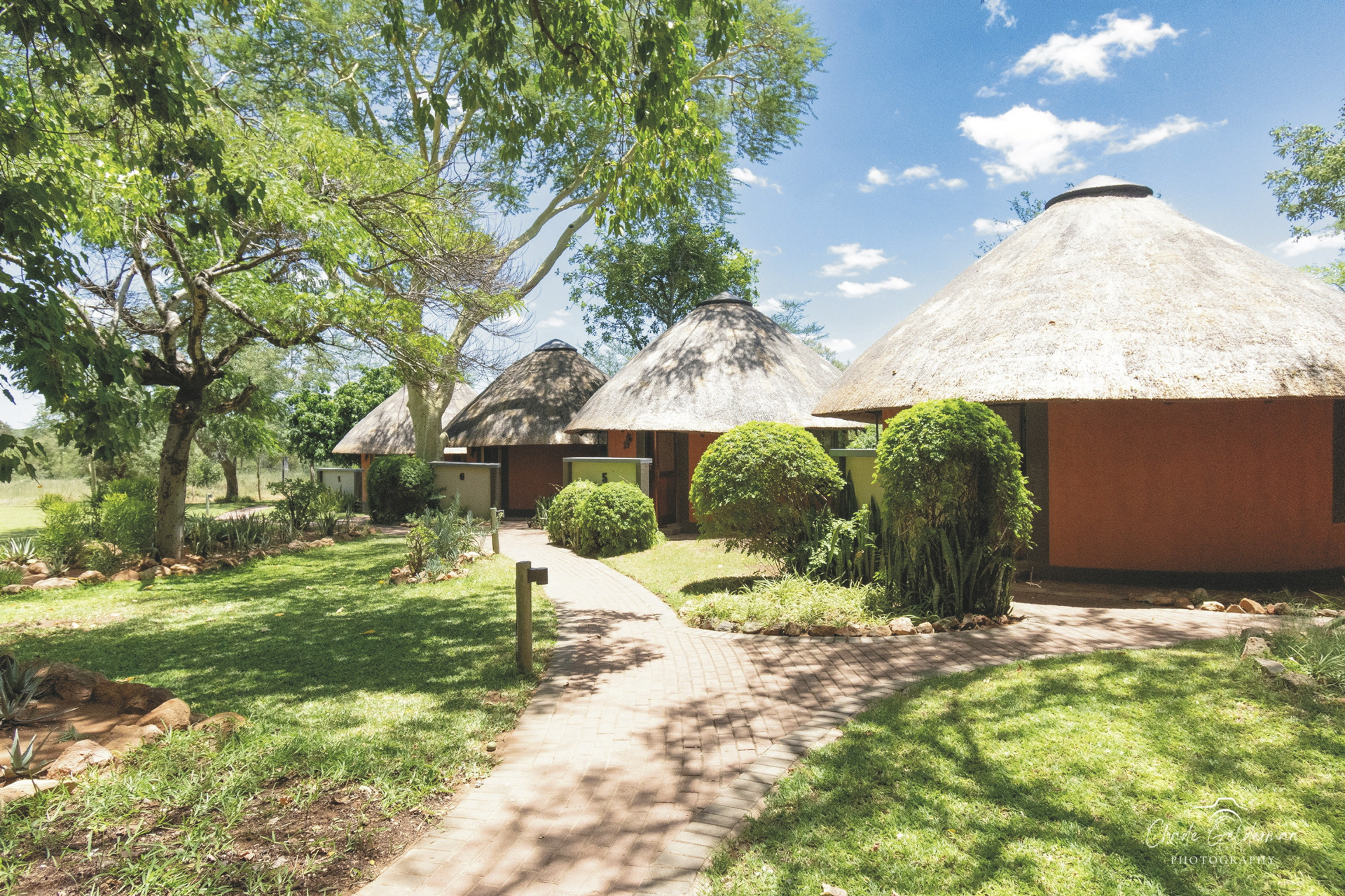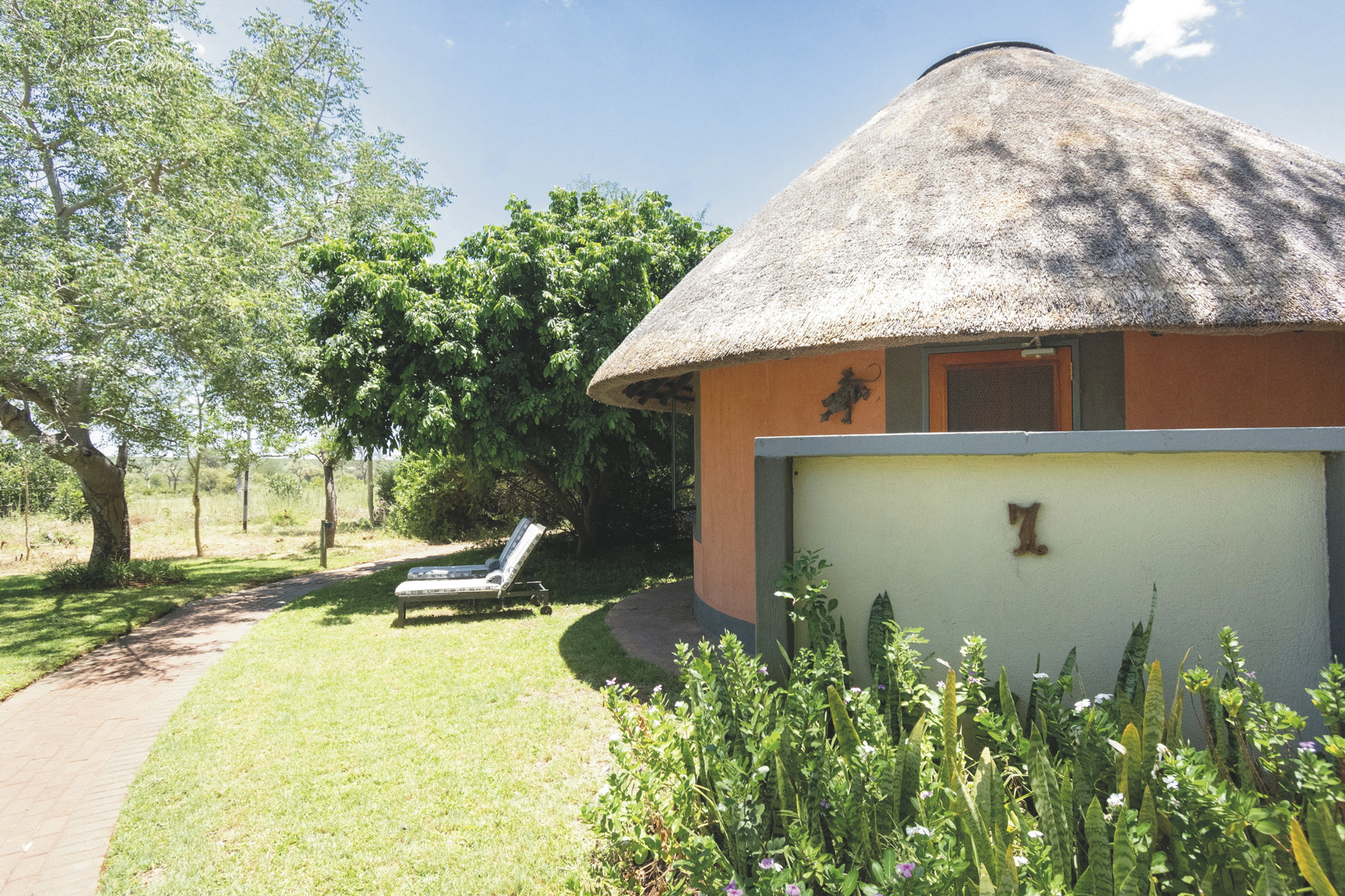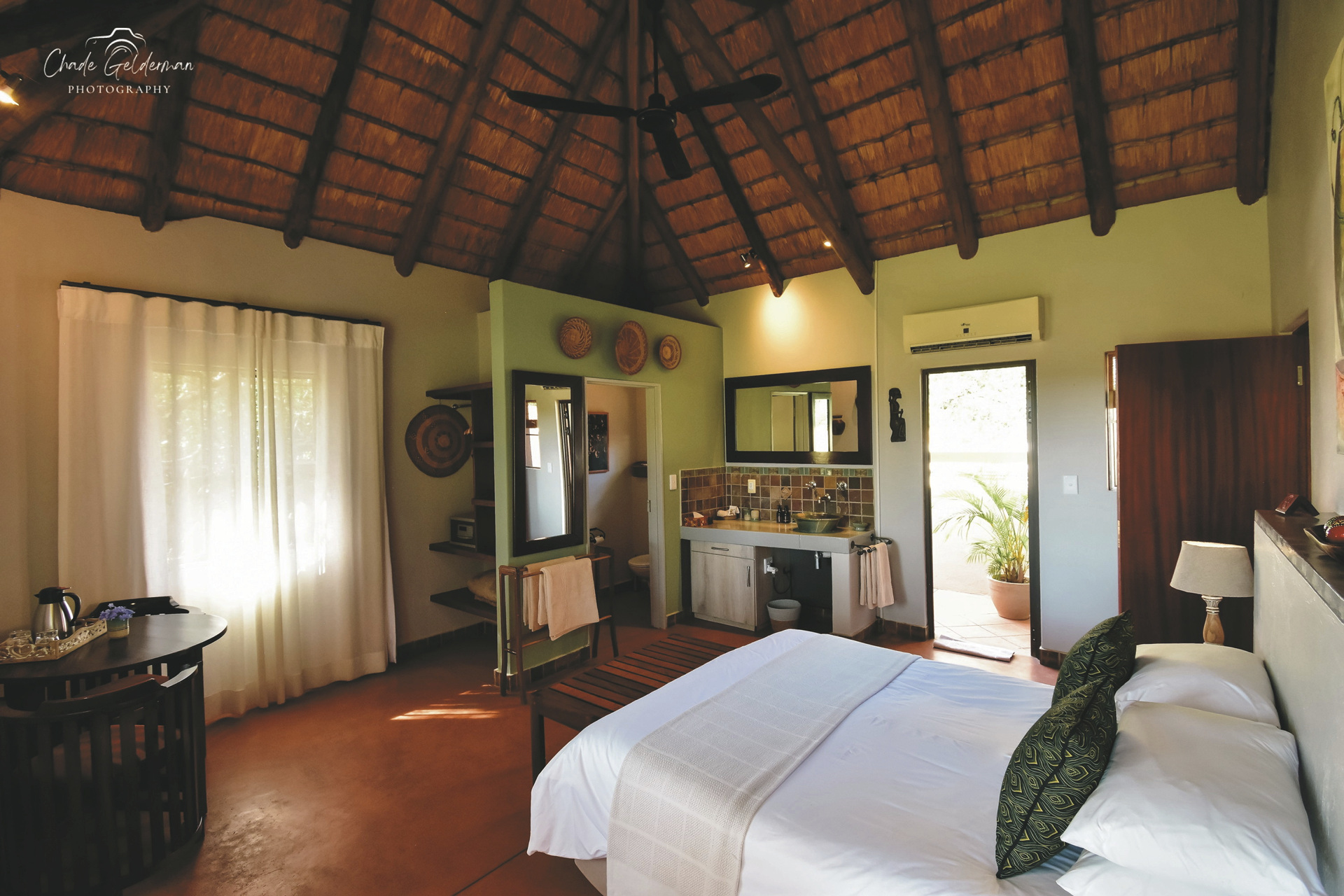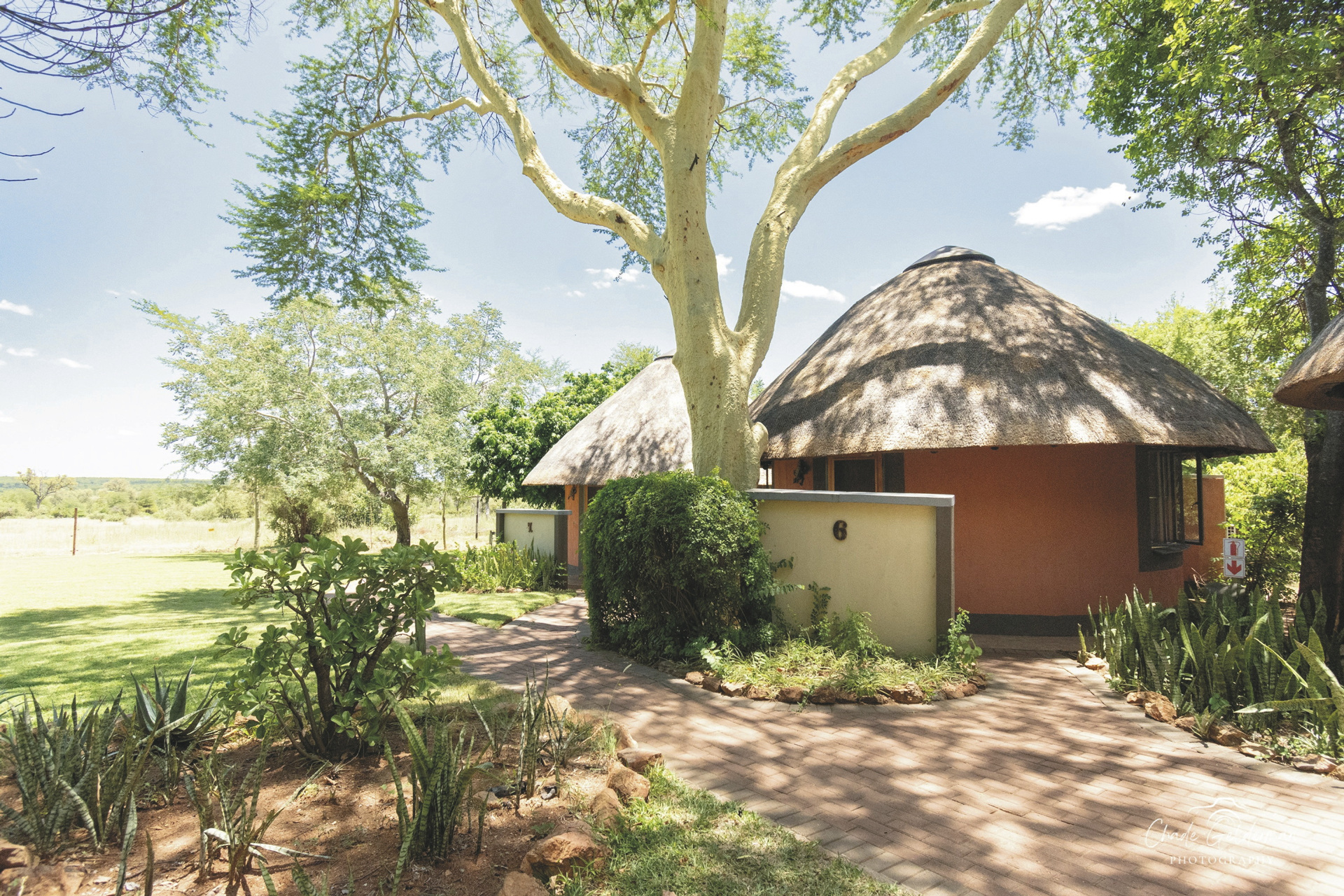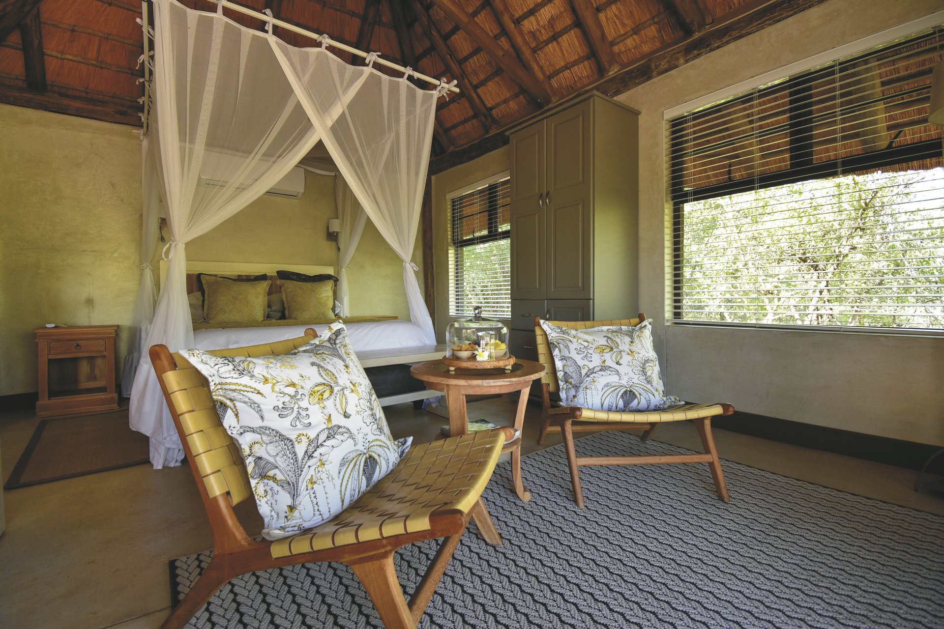 Die Lodge verfügt über 10 wunderschöne riedgedeckte, im afrikanisch-ethnischen Stil dekorierte Rondavels, die unter Schatten spendenden Bäumen stehen. Jedes hat natürlich ein eigenes Bad mit Außendusche, außerdem einen Fön, Safe, kostenloses WLAN, Klimaanlage und einen Ventilator. Es gibt Rondavels mit Verbindungstüren für Familien. Die luxuriöse Suite ist großzügig, modern und klassisch afrikanisch, sie bietet zusätzlich eine Innendusche, Minibar, Lounge und einen privaten Plunge Pool, an dem Sie perfekt entspannen und die afrikanische Sonnen genießen können.