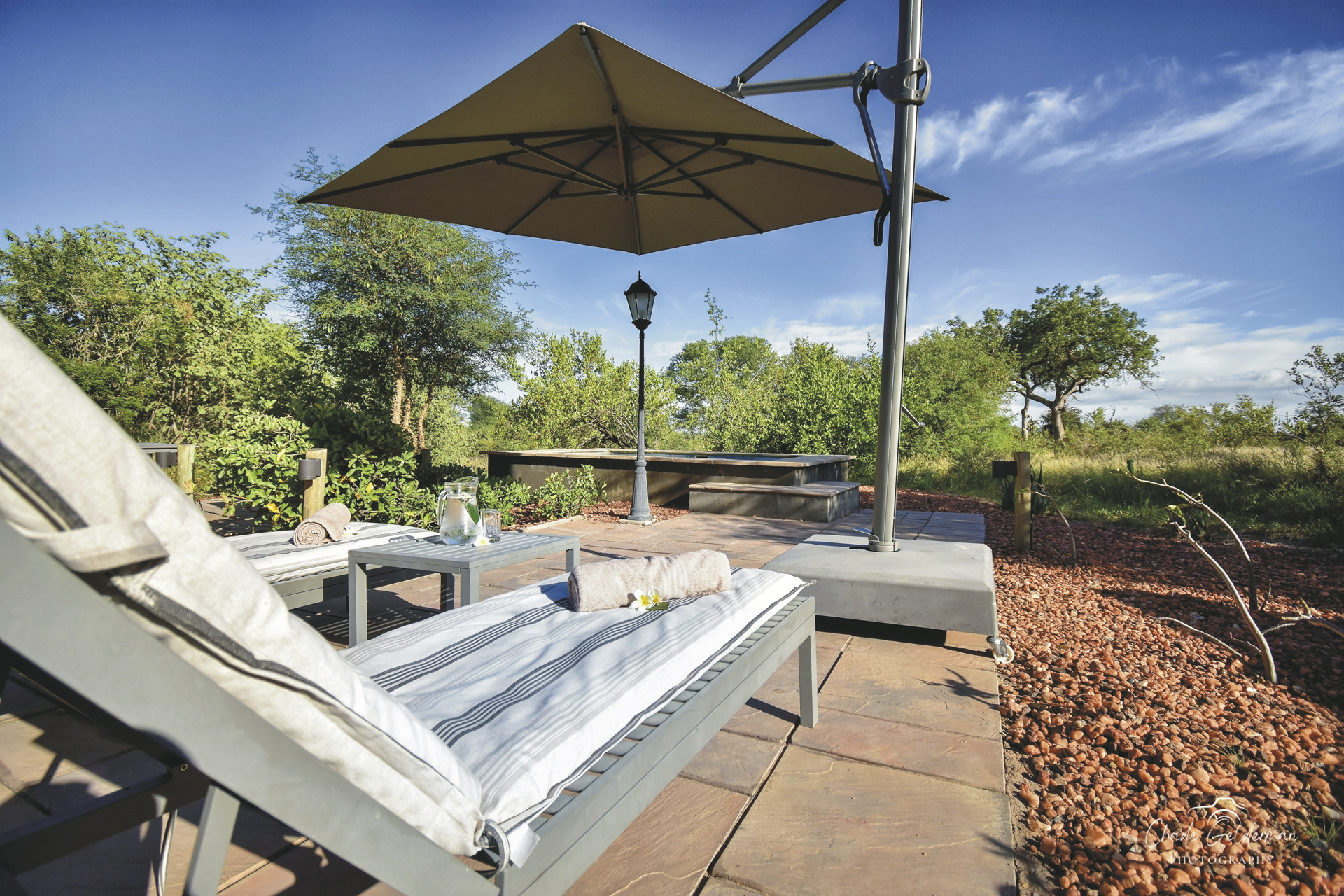 Im Hauptbereich finden Sie eine einladende Lounge, die mit interessanten Holzarbeiten, die vom reichen kulturellen Erbe der Region zeugen, ausgestattet ist, außerdem können Sie handwerklich hergestellte Schmuck- und Dekostücke bestaunen und natürlich auch zur Erinnerung erwerben. Der Barbereich ist offen gestaltet und unwillkürlich schweift der Blick bei einem Aufenthalt immer wieder in den Busch, ob sich nicht vielleicht gerade ein Elefant am Wasserloch einfindet. Der Pool mit seinen Sonnenliegen im Garten kann von den Besuchern am Wasserloch nur schwerlich ablenken. Das Frühstück wird Ihnen im Speisezimmer serviert, unter schattigen Bäumen im Garten das Mittagessen. Abends trifft man sich nach Möglichkeit in der Boma rund um das Feuer, um unter freiem Himmel zu speist. Eines der Markenzeichen von Mohlabetsi ist das außergewöhnliche Essen und das Ambiente der Lodge. Jede Mahlzeit ist ein Genuss und die Atmosphäre immer warm und einladend. Der Hängematten-Garten ist ein ganz besonderer Platz, an dem sich die müssigen Stunden zwischen den Pirschfahrten hervorragend verbummeln lassen. Oder gönnen Sie sich eine entspannende Massage im eigenen Rondavel. Eingeschlossene Aktivitäten: Pirschfahrten. Optionale Aktivitäten: Buschwanderung.