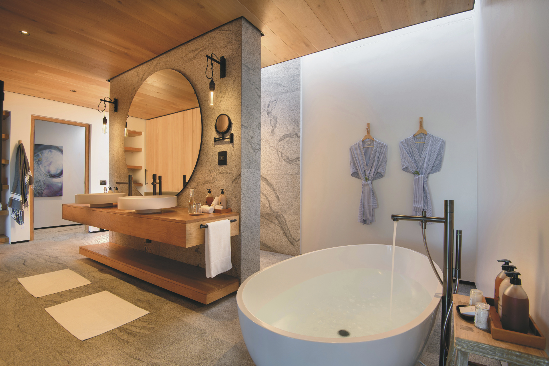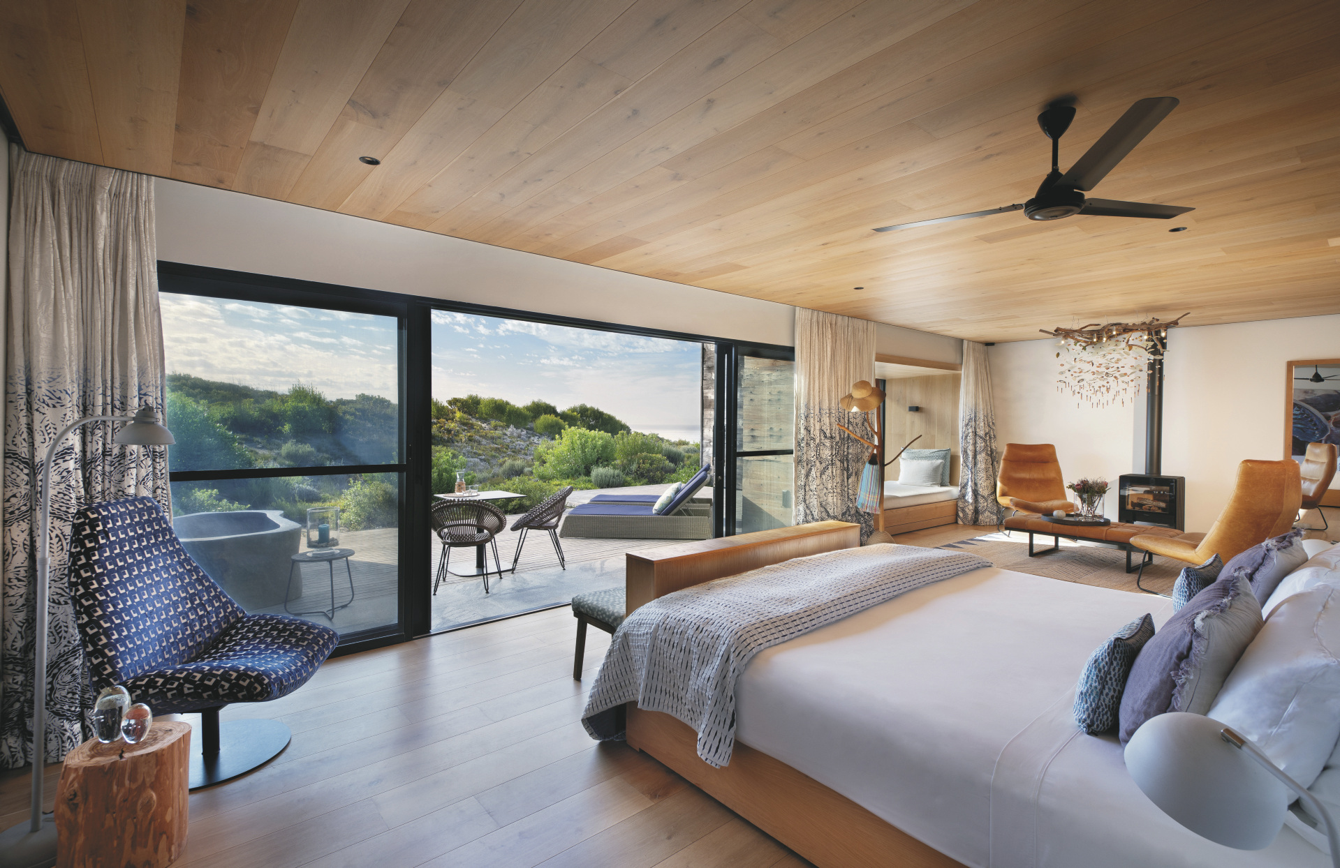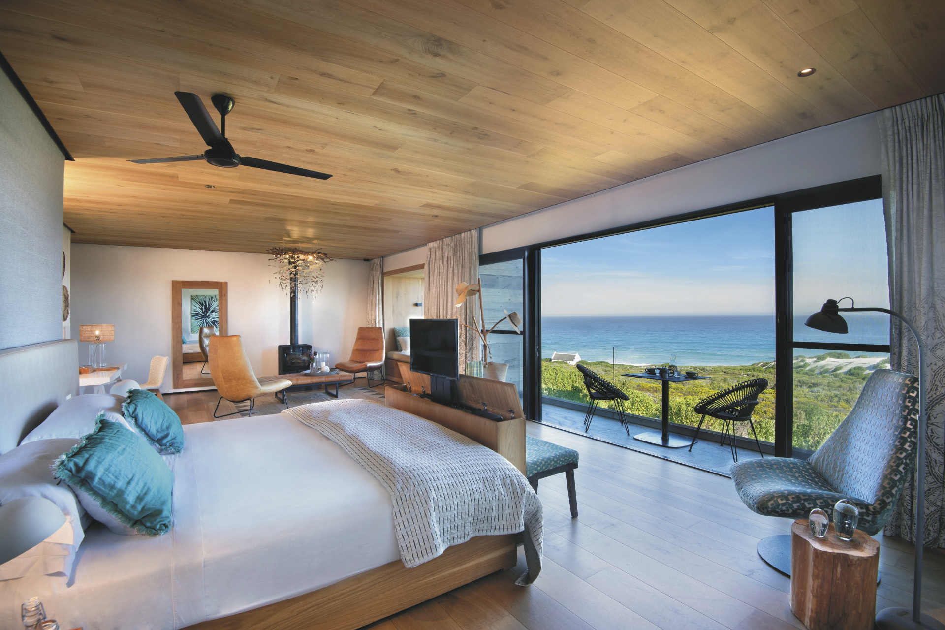 Die 4 geräumigen Suiten glänzen mit einer großen Fensterfront mit Meerblick, klaren Linien und viel hellem Holz. Jede verfügt über ein modernes großzügiges Badezimmer, Kamin, Ventilator, TV, kostenloses WLAN, Tee-/Kaffeezubereiter, Minibar, Safe, Fön und eine kleine Terrasse. Zwei Suiten können in Familienzimmer verwandelt werden, in einer gemütlichen Fensternische wird für Kinder ein extra Bett bereitet. Die Honeymoon Suite liegt mit seitlichem Meerblick etwas zurückversetzt und hat eine tolle Badewanne auf der großen Terrasse.