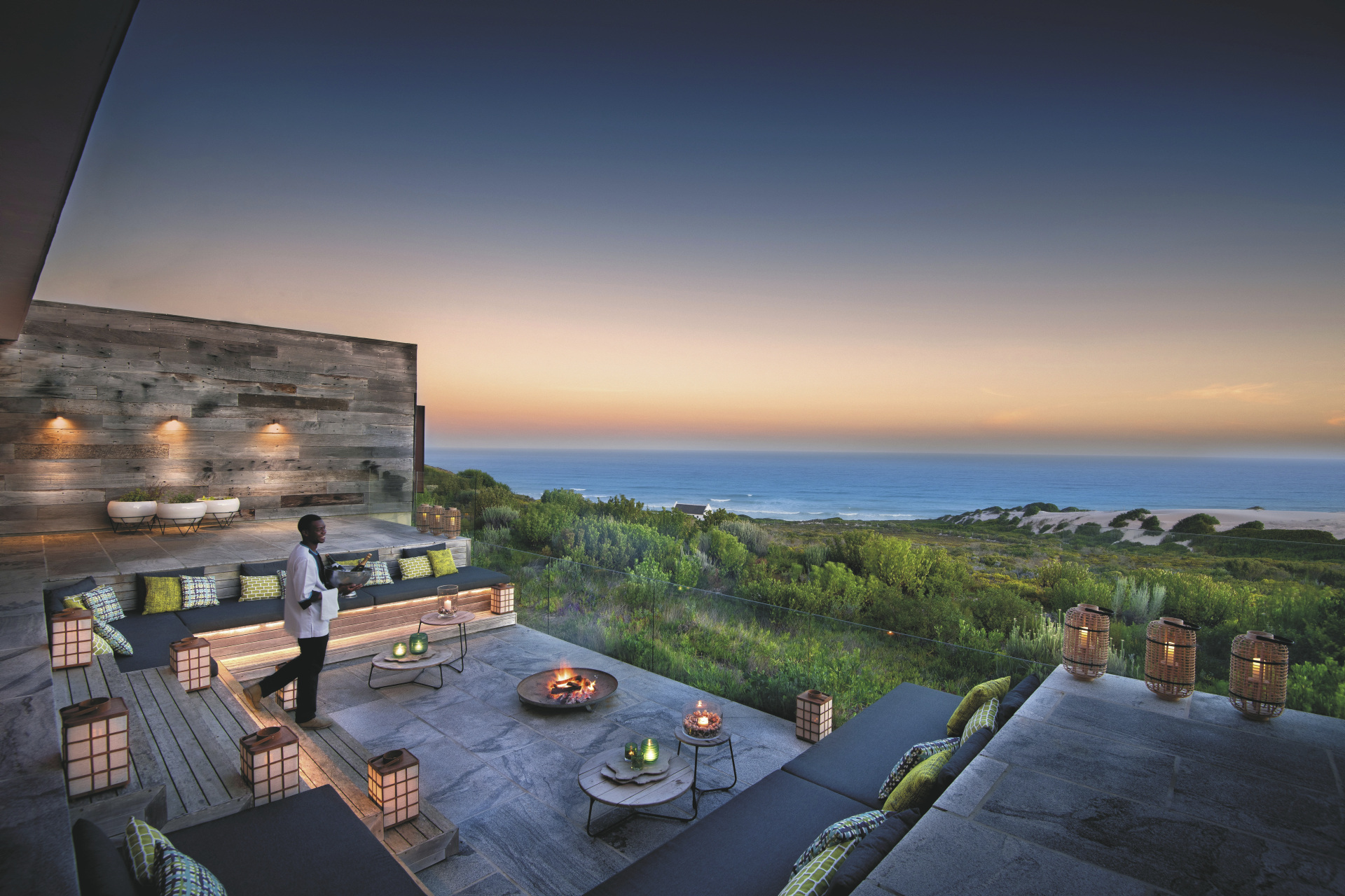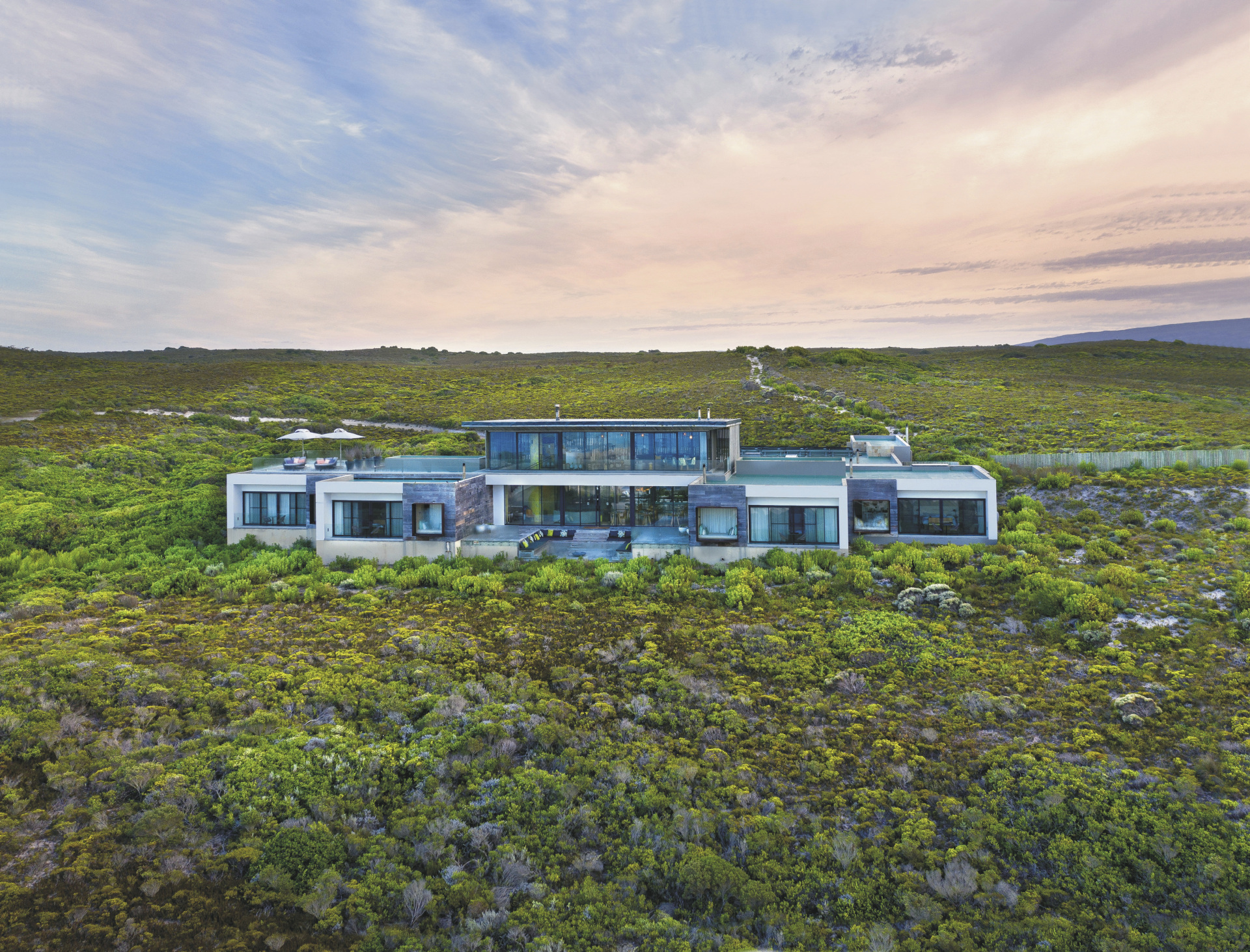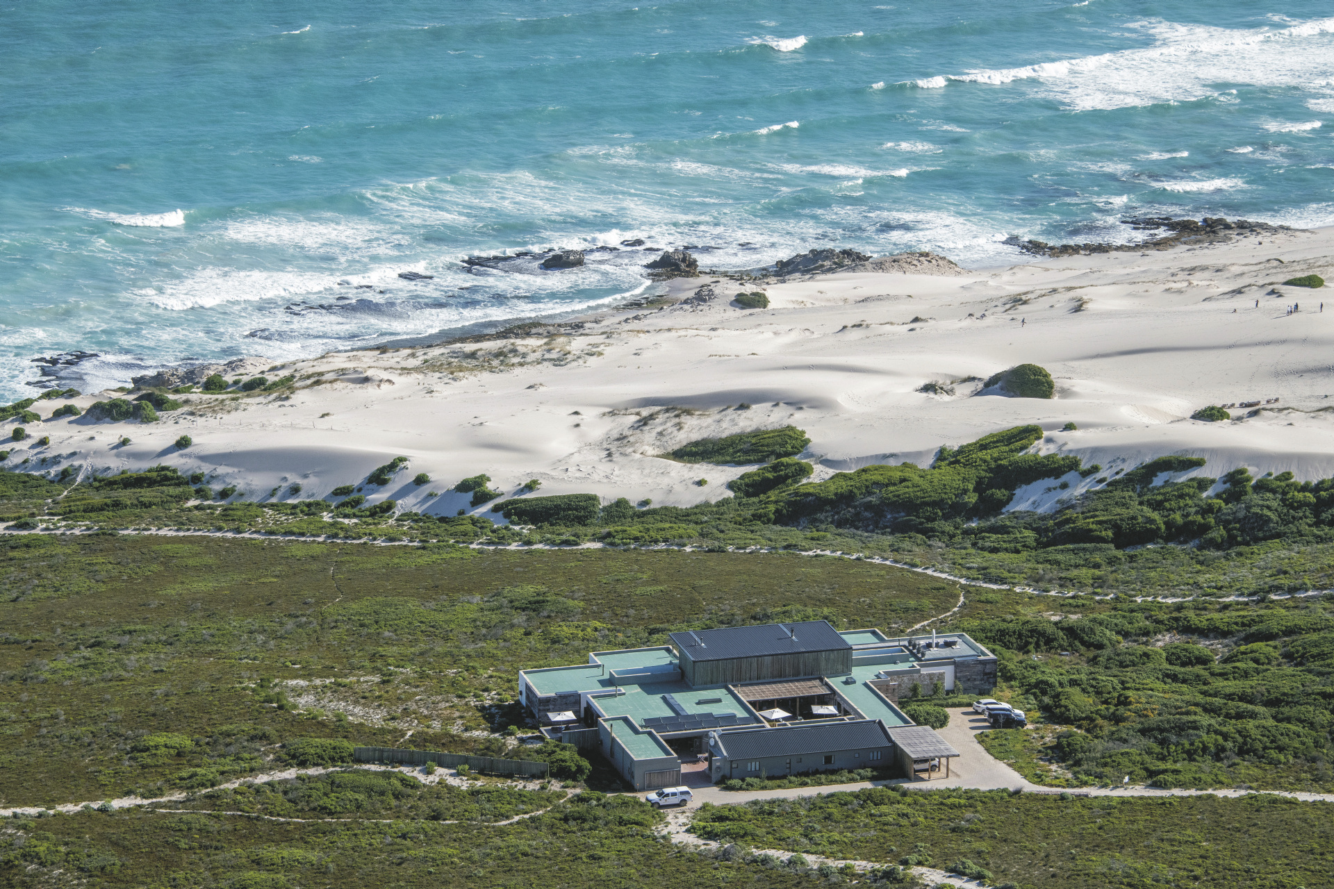 Die kleine Lodge ist modern ausgestattet und liegt in absolut herrlicher Lage. Es gibt viel zu Erleben und Aktivitäten für die ganze Familie. Die Mahlzeiten weder entweder auf der überdachten Terrasse oder im lichtdurchfluteten Speisezimmer eingenommen. Am Abend trifft man sich an der Feuerstelle zum gemütlichen Plausch, oder aber in der oberen Etage der Lodge. Hier befindet sich der Bar- und Loungebereich und eine große Dachterrasse, von der man eine traumhafte Aussicht genießt. Im windgeschützten Innenhof steht ein Pool, ein beheizter "Hot Tub" sowie eine Sonnenterrasse zur Verfügung. Ihr Mittagessen können Sie gerne auch in Form eines Picknicks am Strand, während einer Wanderung oder Fahrradtour genießen. Regelmäßig finden abends Themenabende mit afrikanischer Küche statt. Besonders sind auch die Sonnenuntergänge in den Dünen, wenn eine Auswahl an Getränken und Snacks bereit gestellt werden und man das Ende eines erlebnisreichen Tages zelebriert. Das De Hoop Nature Reserve ist eine der besten Region für landbasierte Walbeobachtungen, es liegt in einem Marineschutzgebiet und Boote sind hier nicht erlaubt. Eingeschlossene Aktivitäten: verschiedene geführte Wanderungen, Mountain Bike Touren, Panoramafahrten, Sand boarding. Außerdem gibt es zahlreiche Wanderwege und Mountain Bike Strecken, auf denen Sie die Umgebung alleine entdecken können, eine Schnorchelausrüstung steht Ihnen ebenfalls kostenfrei zur Verfügung. Optionale Aktivitäten: Walbeobachtung vom Helikopter aus (Juli-Oktober), geführte Wanderung zu den Geiern.