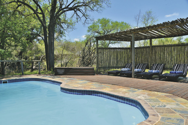 Im offenen Hauptgebäude befindet sich das Speisezimmer mit einer großen Holzveranda, wo überwiegend die Mahlzeiten eingenommen werden, und eine Bar, jeweils mit Blick auf ein Wasserloch im Trockenflussbett. Im Loungebereich brennt am Abend im Kamin ein lauschiges Feuer, hier finden Sie limitiertes WLAN. Unter dem Sternenhimmel sitzt man abends um die Feuerstelle und genießt einen guten Tropfen aus dem wohlsortierten Weinkeller. Ein kleiner Shop, eine Bibliothek und ein Pool mit Sonnenterrasse runden das Serviceangebot ab. Eine Spa-Behandlung kann in der eigenen Suite durchgeführt werden. Eingeschlossene Aktivitäten: Pirschfahrten auf den befestigten Straßen des Krüger Nationalparks und auf den Wegen der eigenen Konzession. Optional kann ein Sleep-Out unter den Sternen Afrikas gebucht werden (ab 4 Personen ohne Extrakosten).