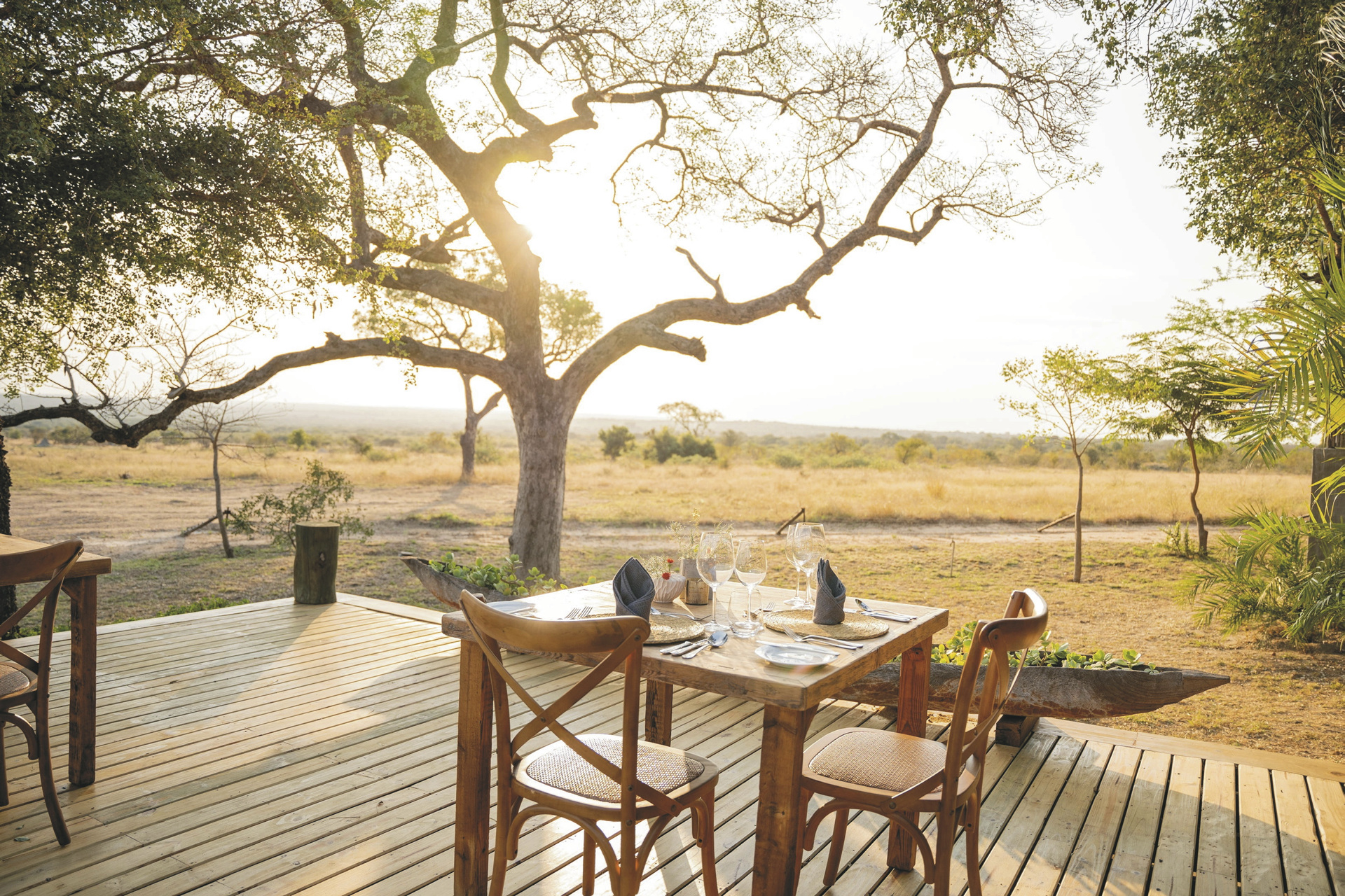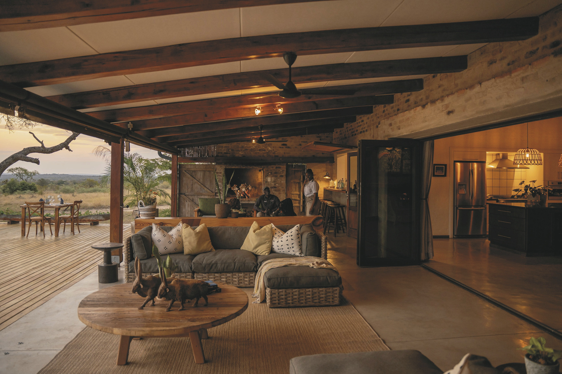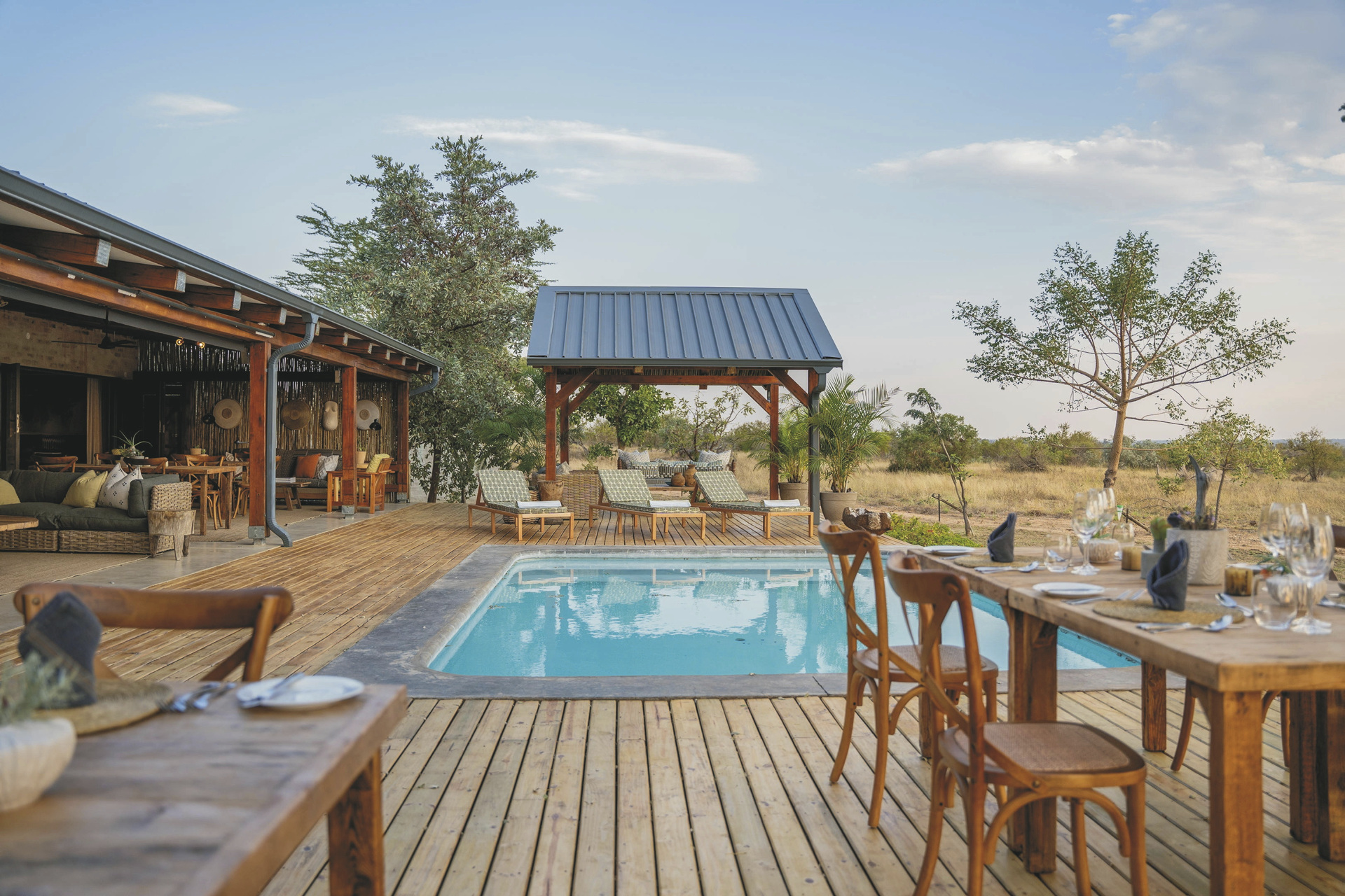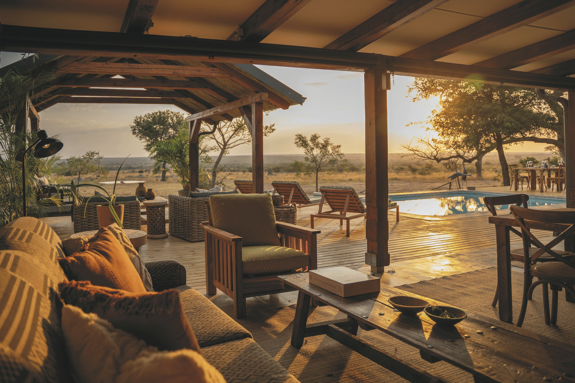 Das Haupthaus ist gemütlich wie ein privates Wohnhaus mit offener Küche, Lounge, Speisezimmer, Bar und TV-Zimmer eingerichtet. Licht durchflutet mit großen Fenstern, gemütlichen Sofas und Sitzecken auf der Terrasse lädt es zum Verweilen, Beobachten und Entspannen ein. Von der großen überdachten Terrasse, auf der bei gutem Wetter die Mahlzeiten eingenommen werden und dem Poolbereich hat man einen freien Blick auf das nahe gelegenen Wasserloch. Ein besonderer Höhepunkt sind immer die Abendessen in der Boma, rund um ein flackerndes Feuer unter den Sternen Afrikas. Eingeschlossene Aktivitäten: Pirschfahrten.