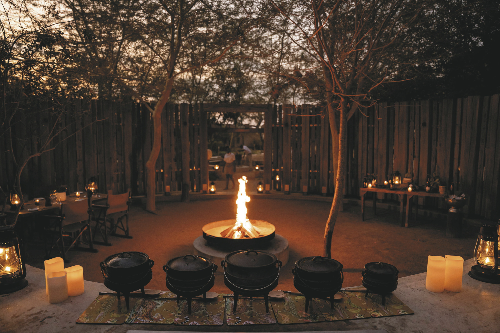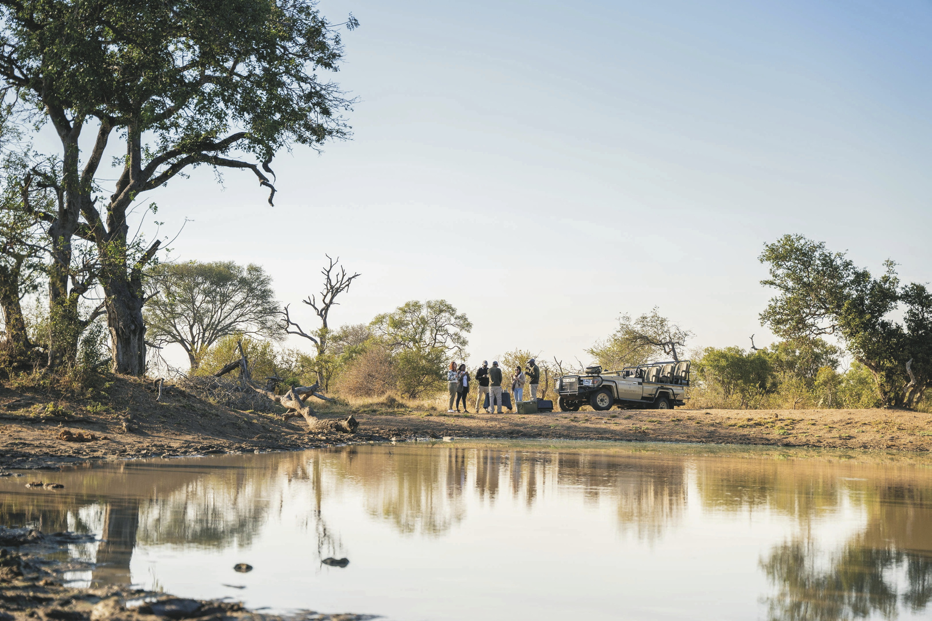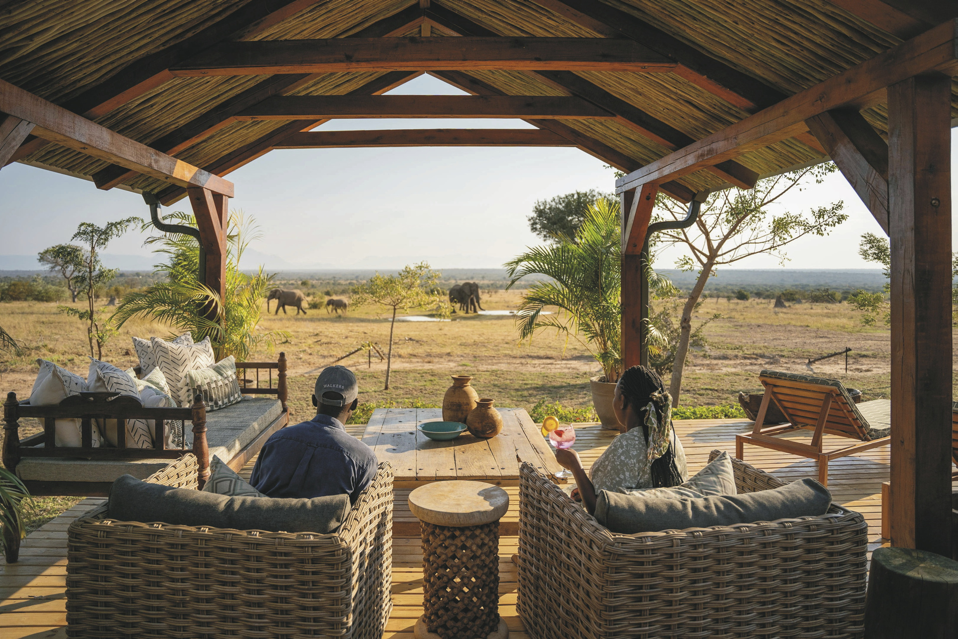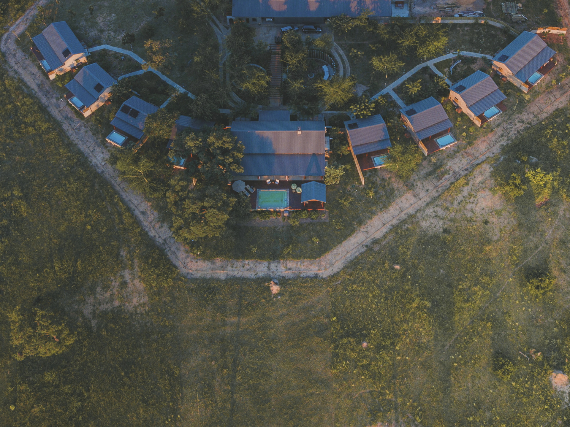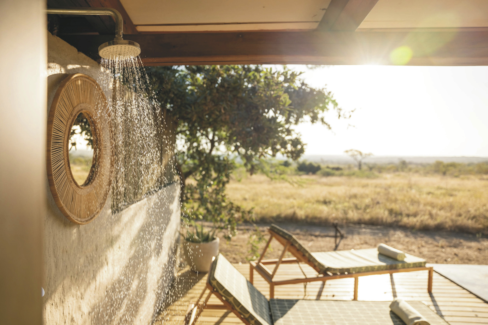 Das Haupthaus ist gemütlich wie ein privates Wohnhaus mit offener Küche, Lounge, Speisezimmer, Bar und TV-Zimmer eingerichtet. Licht durchflutet mit großen Fenstern, gemütlichen Sofas und Sitzecken auf der Terrasse lädt es zum Verweilen, Beobachten und Entspannen ein. Von der großen überdachten Terrasse, auf der bei gutem Wetter die Mahlzeiten eingenommen werden und dem Poolbereich hat man einen freien Blick auf das nahe gelegenen Wasserloch. Ein besonderer Höhepunkt sind immer die Abendessen in der Boma, rund um ein flackerndes Feuer unter den Sternen Afrikas. Eingeschlossene Aktivitäten: Pirschfahrten.