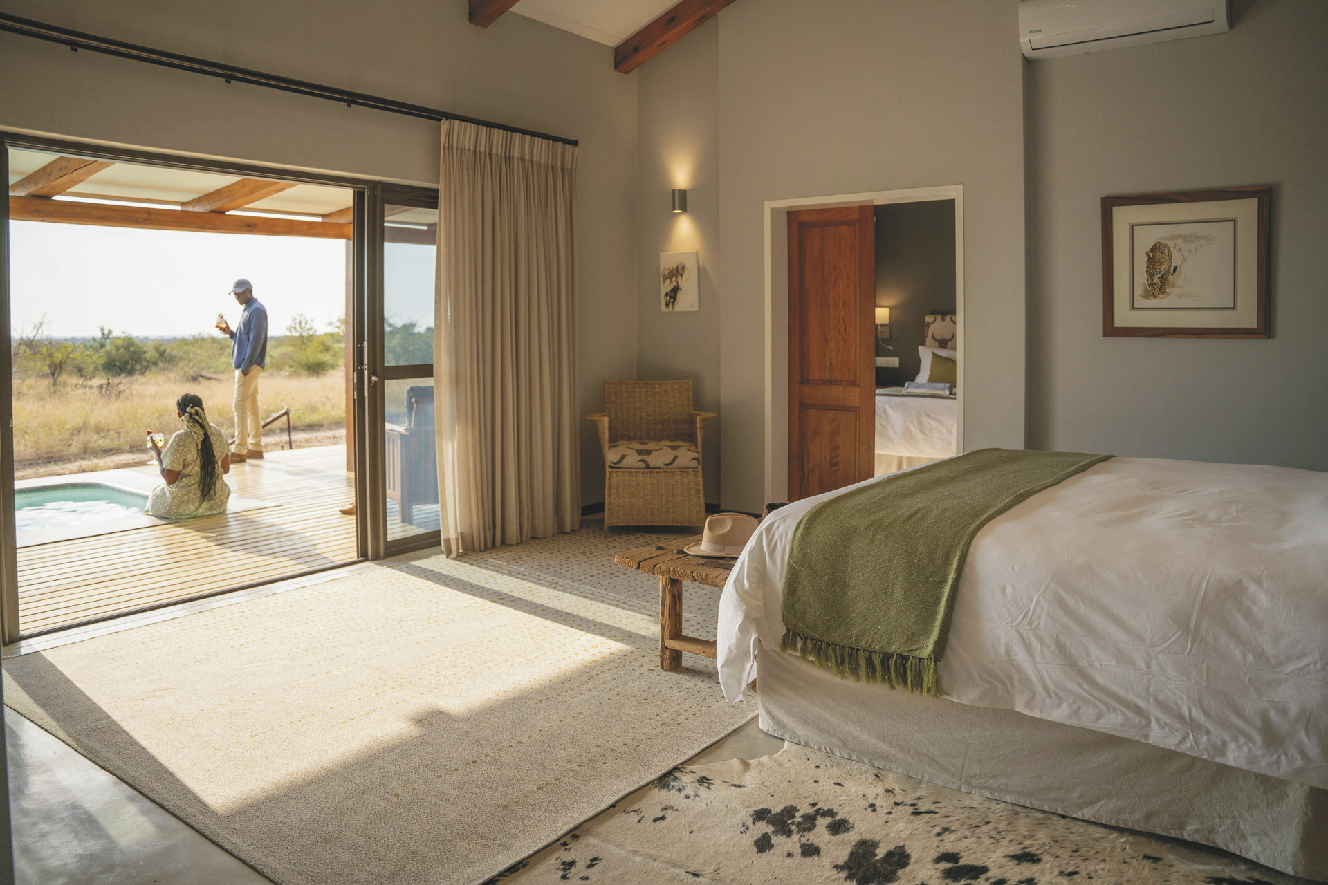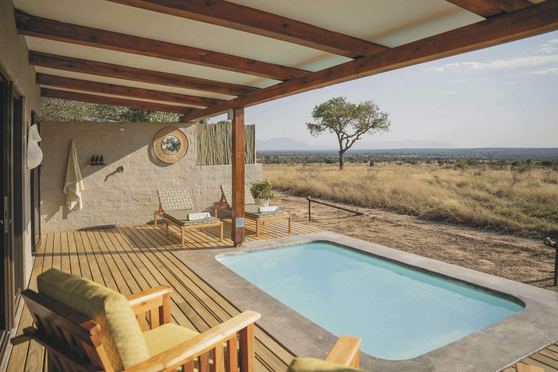 Die insgesamt 8 hellen und im modernen Safaristil eingerichteten Zimmer liegen alle direkt am Wildzaun und bieten somit einen tollen Blick durch die bodentiefen Fenster in die Savanne. Jedes verfügt über ein eigenes Badezimmer mit Außendusche, Klimaanlage, Ventilator, WLAN, Minibar, Safe und über eine überdachte Terrasse mit Plunge-Pool. Die 2 Familienzimmer haben ein zweites Badezimmer mit Innendusche und 4 Personen komfortabel Platz.