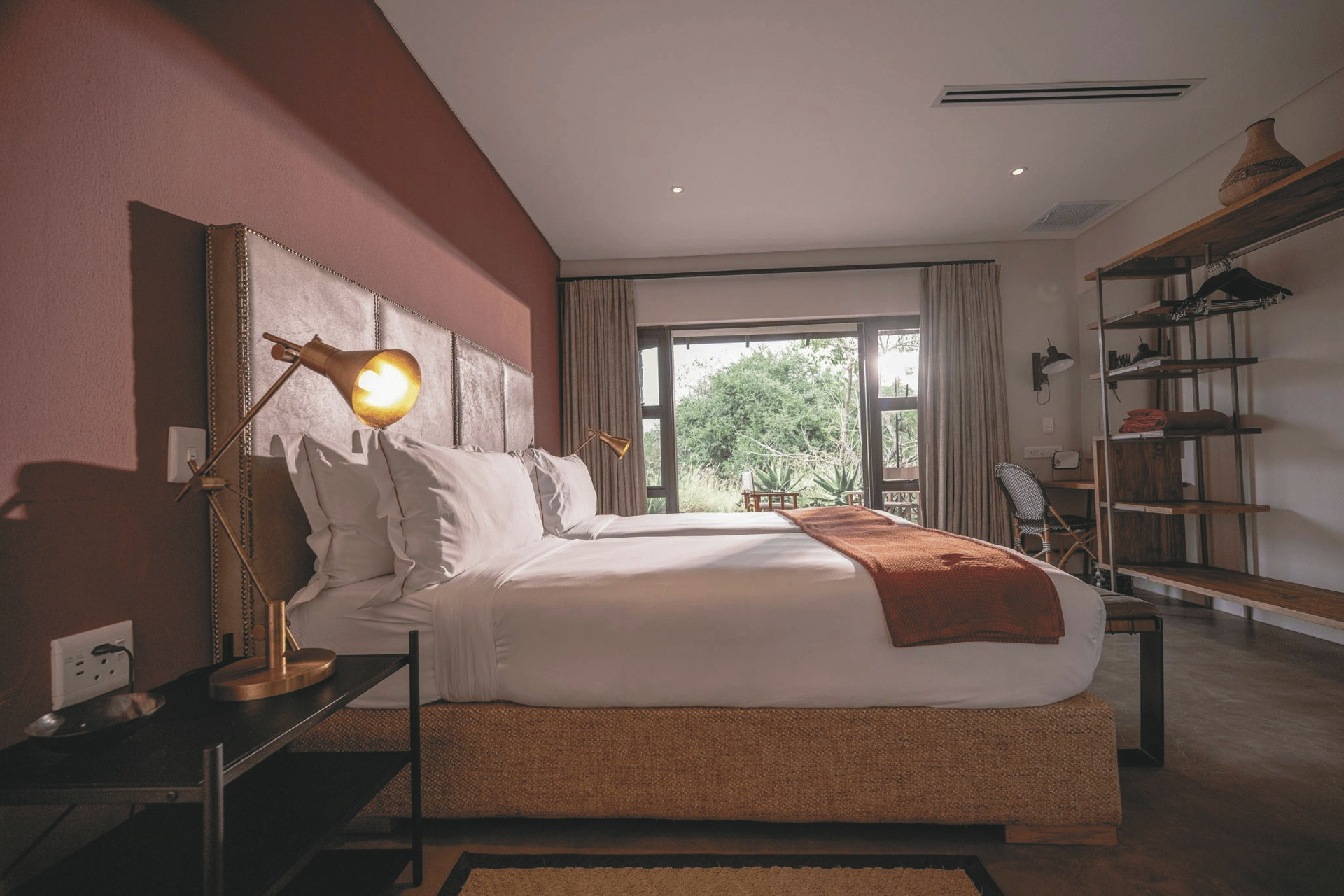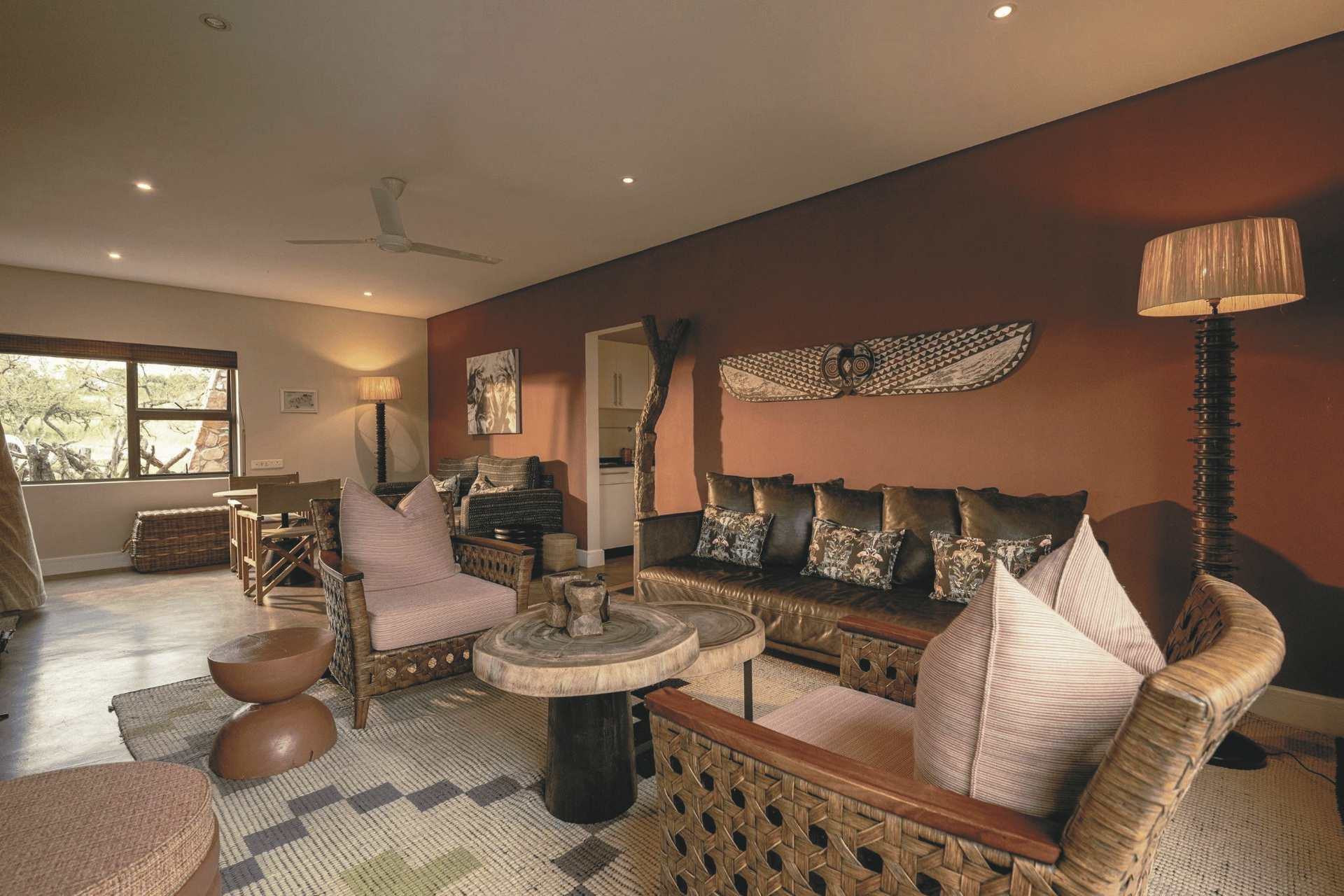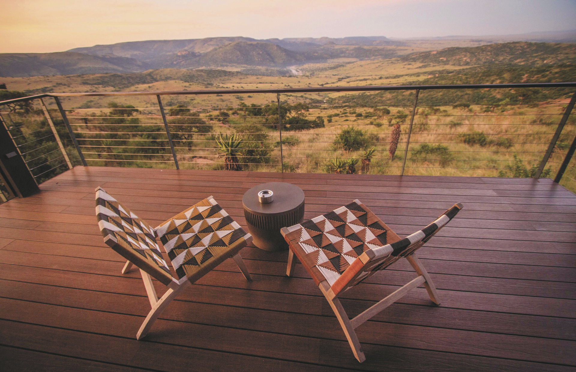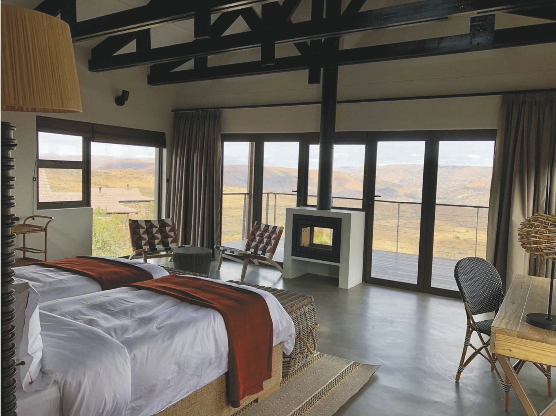 Dieses Panorama wird Ihnen in Erinnerung bleiben und ist sicherlich einer der Höhepunkte Ihres Aufenthaltes. Im zentralen Bereich der uneingezäunten Lodge befindet sich ein großzügiger kombinierter Lounge-, Bar- und Speisebereich. Afrikanisch dekoriert, mit großen Bildern und einem Kamin für kühle Abende definitiv ein Platz zum Verweilen. Die große Fensterfront gibt den Blick hinunter ins Tal frei. Auf der Terrasse werden meist die Mahlzeiten serviert, von hier sind es nur wenige Schritte zum Pool und der Sonnenterrasse, oder auch zur Feuerstelle, wo am Abend ein Feuer flackert. Nach einem aufregenden Tag bildet ein köstliches Abendessen in der Boma unter dem funkelnden Sternenhimmel und im Schein von Petroleumlampen und offenem Feuer einen gelungenen Abschluss. Eingeschlossene Aktivität: Pirschfahrten. Optionale Aktivitäten: Fußpirsch, Busch-Picknick, Besuch der stillgelegten Kupfermine, Ausflug zu den ehemaligen Schlachtfelder (Battlefields) und Tier-Tracking mit einem Ranger.