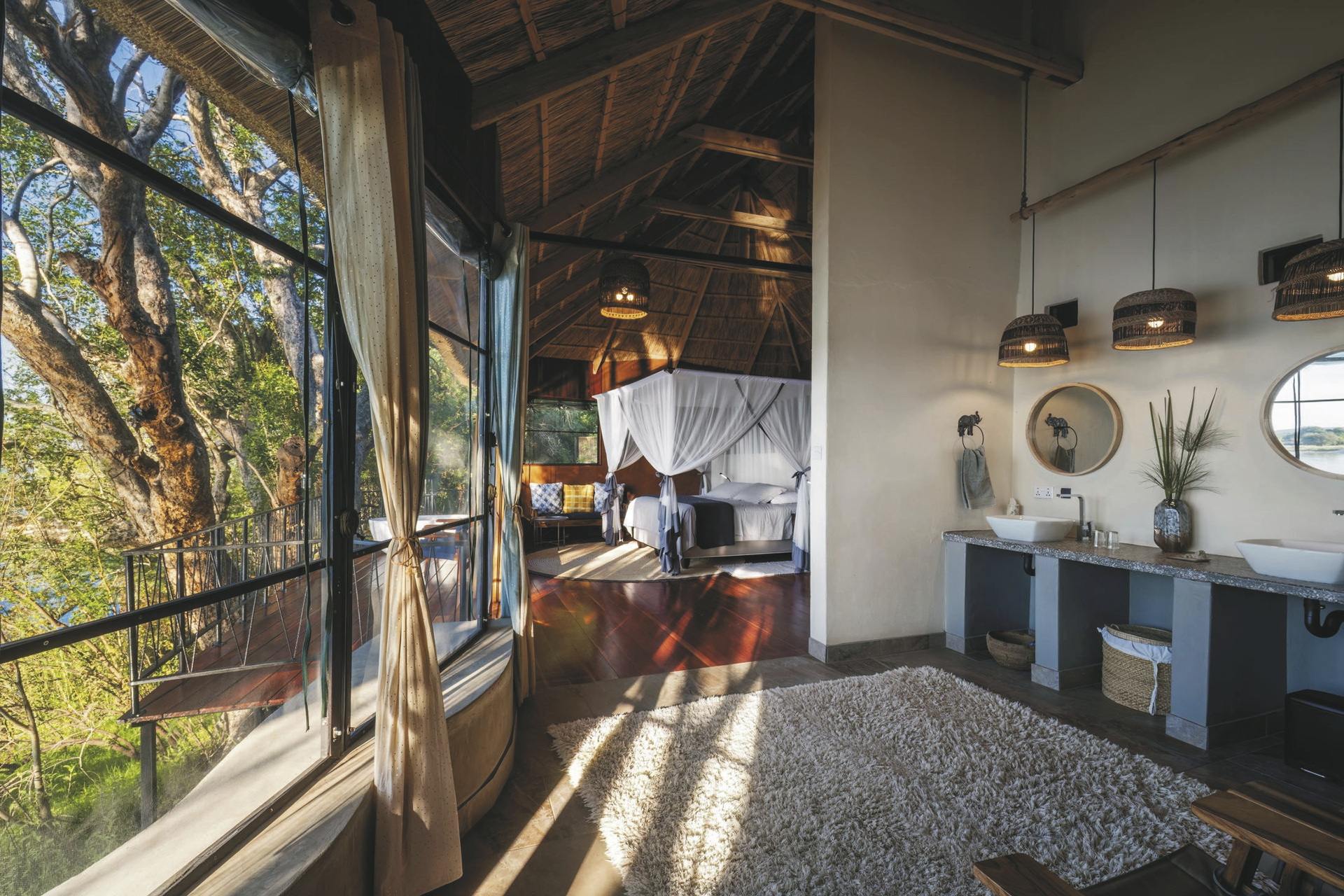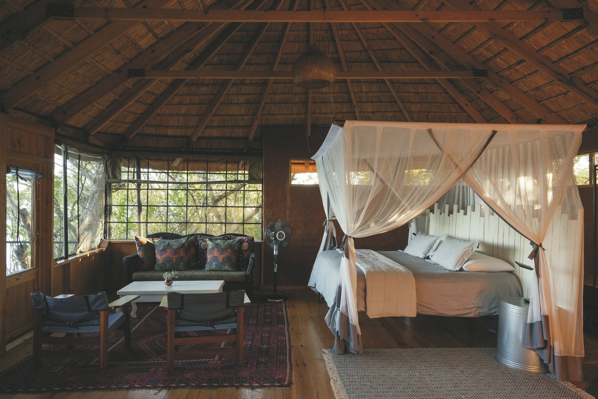 Die offenen und strohgedeckten Riverside Chalets bieten einen direkten Blick auf den Zambezi und sind alle individuell und einzigartig gestaltet. Sie verfügen über ein komfortables Doppelbett mit Moskitonetz, ein eigenes Badezimmer mit Dusche sowie eine private Veranda mit Sitzgelegenheiten. Die Einrichtung ist rustikal und stilvoll, mit natürlichen Materialien und liebevollen Details. Durch die offene Bauweise erleben Sie die Geräusche und Düfte der Natur hautnah – ein echtes Safari-Gefühl. Das Chundu Cottage ist ein charmantes Familienhaus mit zwei Schlafzimmern, einem großzügigen Wohnbereich und einer eigenen Terrasse mit Flussblick. Es bietet viel Platz und Privatsphäre, ideal für Paare oder kleine Familien.