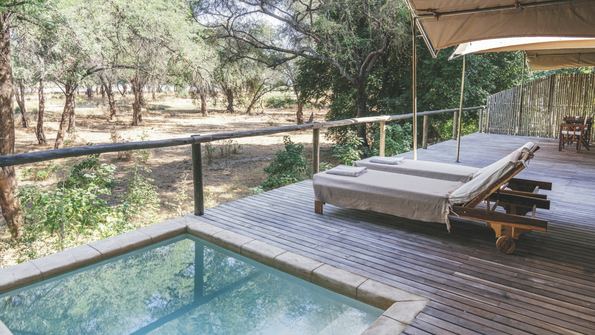 Die 12 Luxus-Zelte sind großzügig geschnitten und mit edlen Materialien ausgestattet. Jede Unterkunft verfügt über ein großes Bett mit Moskitonetz, eine Lounge-Ecke, eine freistehende Badewanne sowie eine Außendusche mit Blick ins Buschland. Die großen Panoramafenster und privaten Decks mit Plunge Pool bieten einen ungestörten Blick auf den Zambezi oder die Winterthorn-Wälder.