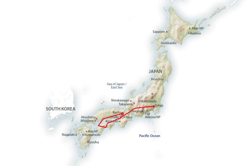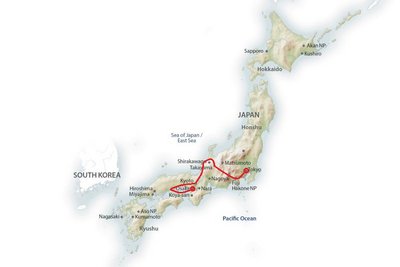 Von der Metropole Tokyo geht es über Nagoya und Osaka nach Shikoku, wo Sie ursprüngliche Küsten und traditionsreiche Dörfer entdecken. Weiter führt die Reise nach Matsuyama, Kurashiki und schließlich Kyoto. Diese Route vereint das pulsierende Japan mit seinen spirituellen Wurzeln und kulturellen Schätzen.