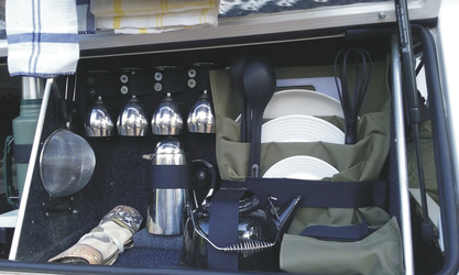 1 Dachzelt (1,40 m x 2,25 m) bzw. 2 Dachzelte (1,30 m x 2,40 m), Campingtisch/-stühle, Kühlschrank, Kühlbox, Gaskocher, 20 l Frischwasserkanister, Grill, Geschirr, Besteck, Kochutensilien.