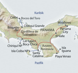 Üppige Flora und Fauna, ein vielfältiges kulturelles Leben und einsame Strände erwarten Sie bei dieser Reise. Entdecken Sie die Schönheiten Panamas in Ihrem eigenen Tempo. Entlang des Pazifiks laden weiße, einsame Strände zu einem Bad ein. Spannend ist auch eine Wanderung durch den Nebelwald Boquete. Am Ende der Reise erreichen Sie Bocas del Toro, wo sie einen entspannten Badeaufenthalt an einem der wohl schönsten Orte Panamas anschließen können.