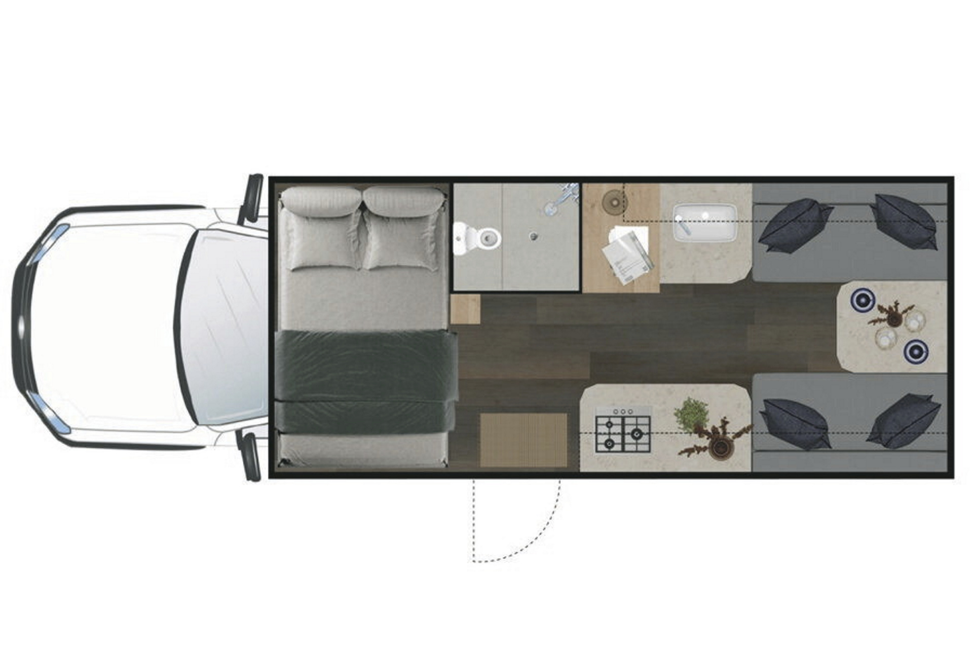 • festes Doppelbett über der Fahrerkabine 1,90 x 1,50 m• Hecksitzgruppe, zum schmalen Doppelbett umbaubar: 1,90 x 1,10 m