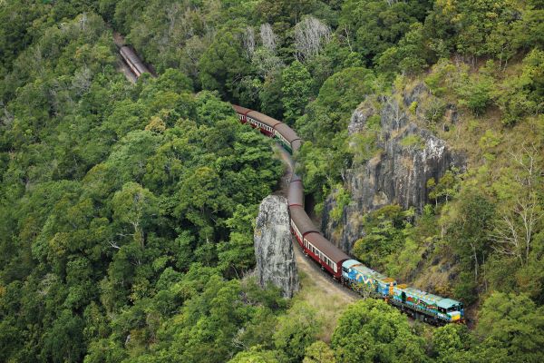 - Die historische Kuranda Scenic Railway – eine der schönsten Bahnstrecken Australiens, mit Tunneln, Wasserfällen und spektakulären Ausblicken
