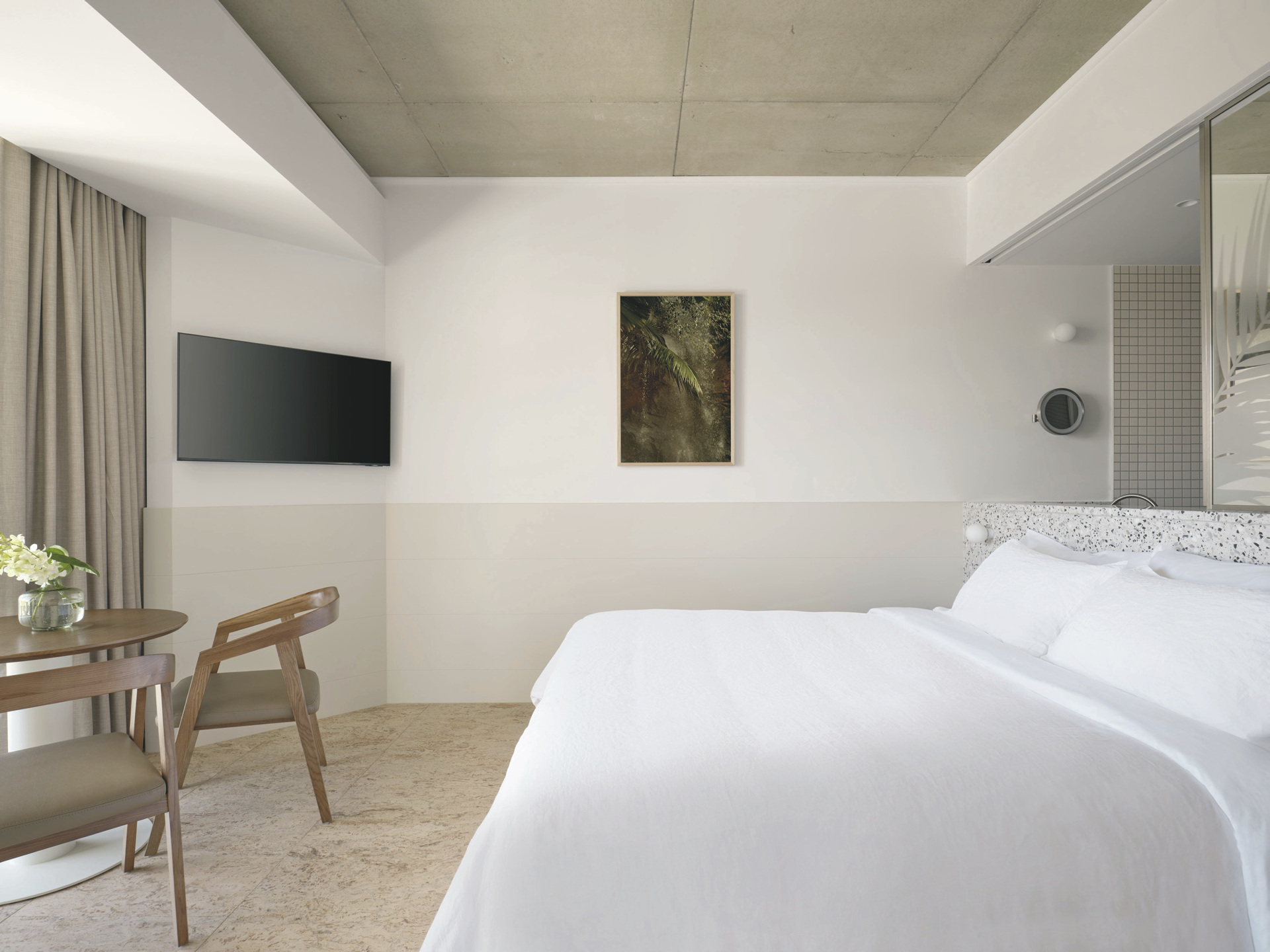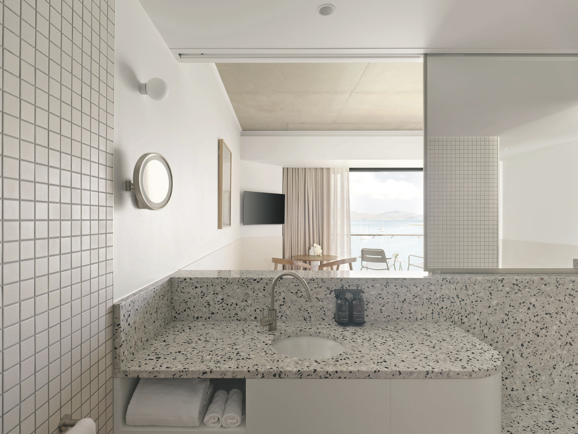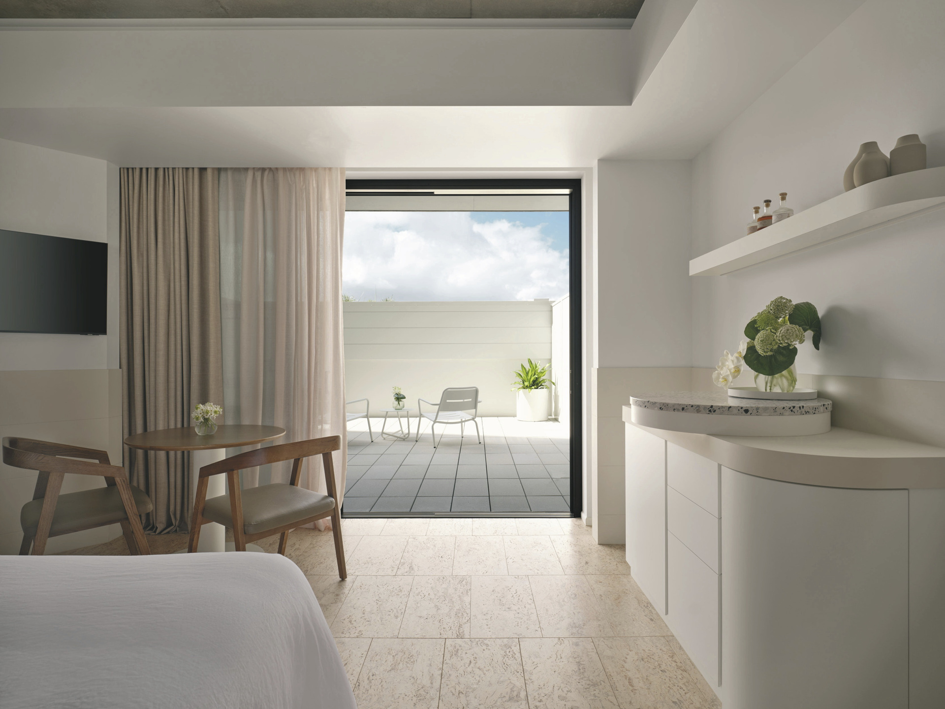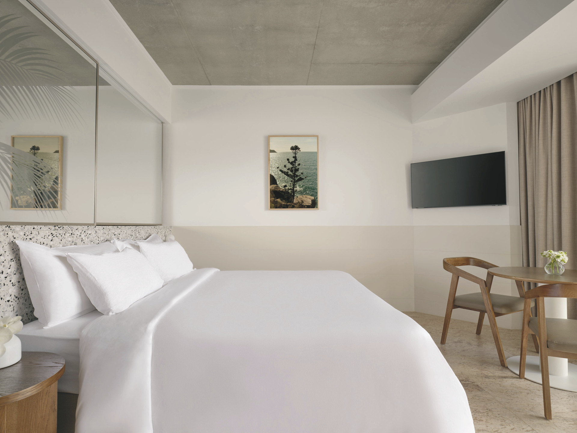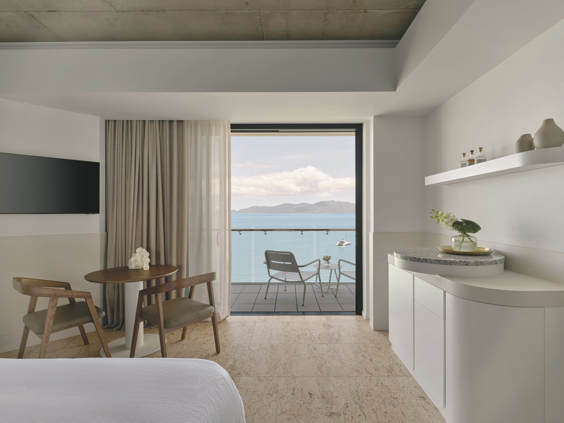 Die 132 Zimmer und Suiten sind modern gestaltet und zeichnen sich durch klare Linien sowie hochwertige Materialien aus. Zur Ausstattung zählen u.a. Klimaanlage, Bad mit Dusche, Fön, Kingsize-Doppelbett oder zwei Einzelbetten, TV, Zimmersafe, Minibar sowie Tee-/Kaffeezubereiter. Courtyard-Zimmer liegen im Erdgeschoss, sind ca. 33 m² groß und bieten als Besonderheit eine private, möblierte Terrasse. Marina-Zimmer und Ocean-Zimmer bieten dieselbe Größe und Komfort, haben aber statt der Terrasse einen Balkon mit Blick auf den Hafen oder das Korallenmeer.