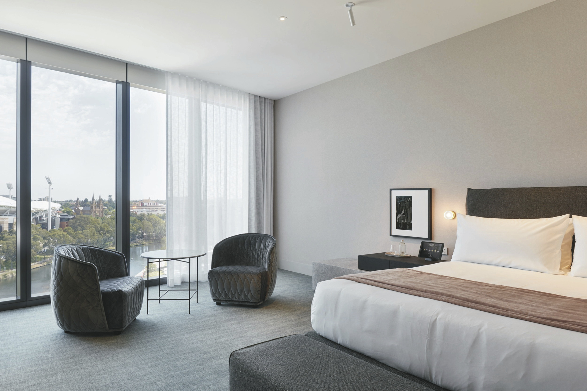 120 modern und geschmackvoll eingerichtete Zimmer und Suiten, die sich auf den oberen Etagen des Hotels befinden und einen atemberaubenden Blick auf die Stadt bieten. Jedes Zimmer verfügt über große Fenster, die viel Tageslicht hereinlassen, mit einer hochwertigen Ausstattung und ein luxuriöses Bad. Allure-Zimmer sind zwischen 40 m² und 57 m² groß, mit einem Kingsize-Bett oder zwei Queen-Betten ausgestattet und bieten wahlweise Stadt- oder Flussblick.Die Radiance-Suiten sind zwischen 94 m² und 129 m² groß und haben einen separaten Wohnbereich mit Lounge und Esstisch sowie besonders geräumige Badezimmer. Vom Kingsize-Bett haben Sie einen unvergleichlichen Blick auf den Fluss.