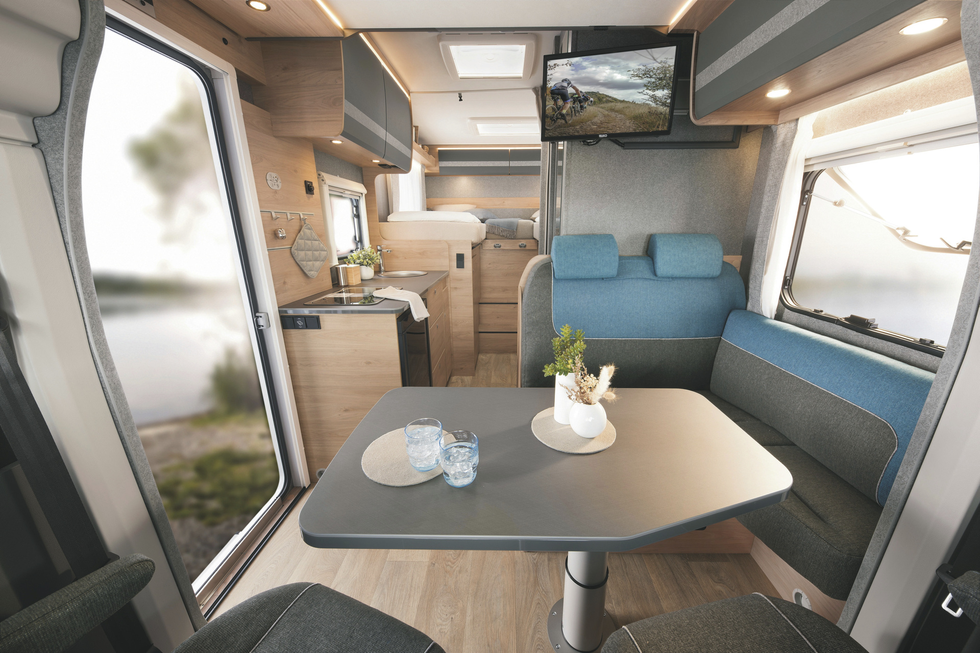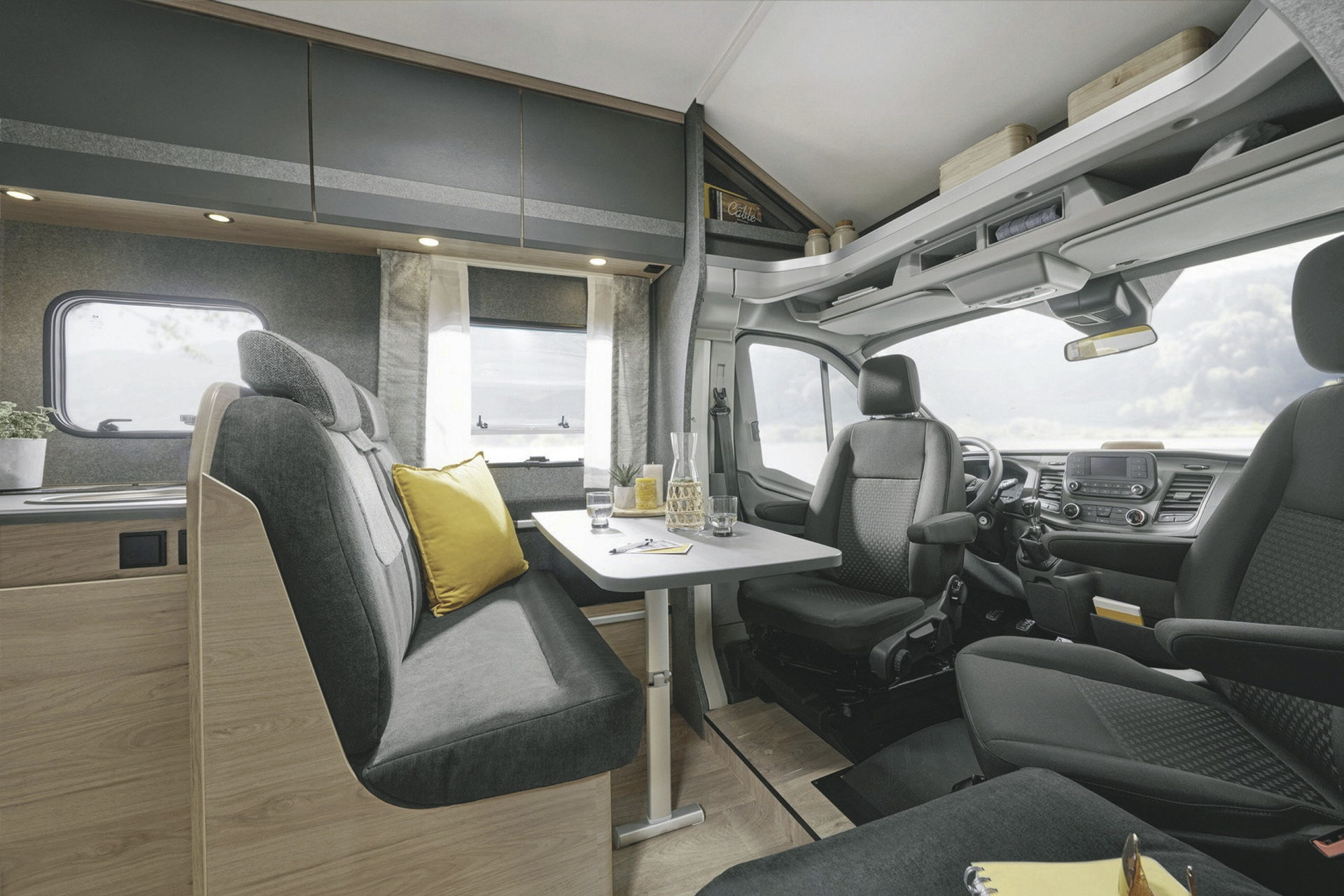 • 2 Sitzplätze in der Fahrerkabine (zum Wohnbereich drehbar)