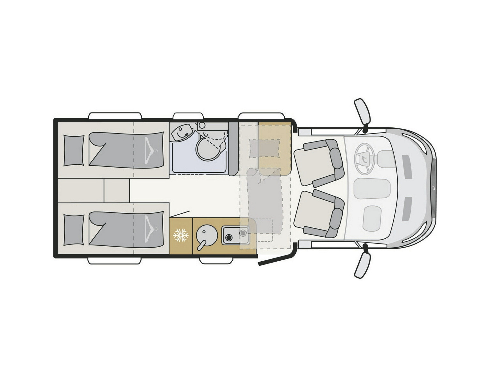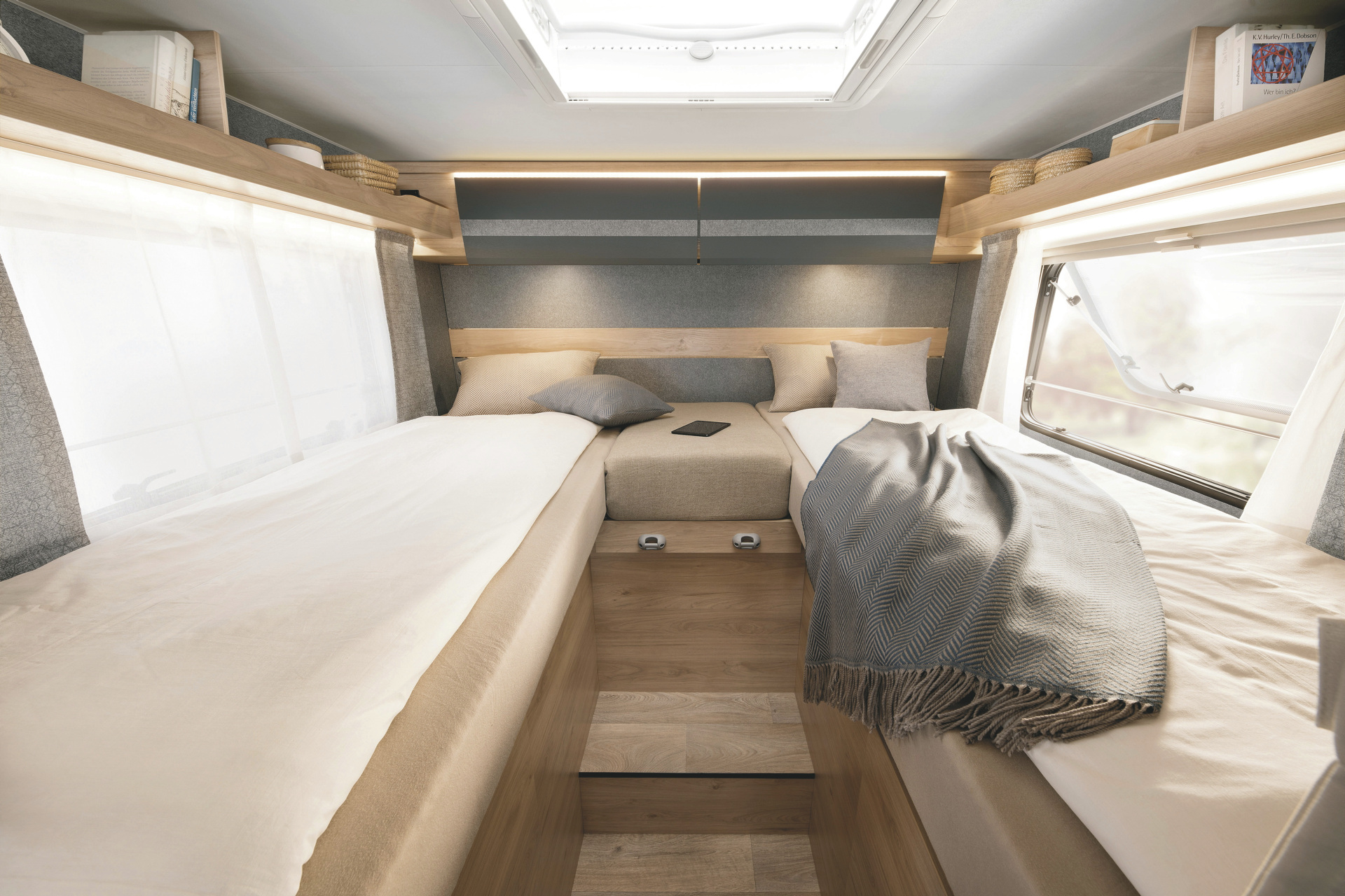 • 2 Einzelbetten (je ca. 2,00 x 0,80 m), zum King Bed für 3 Personen erweiterbar• vom Dach absenkbares Einzelbett hinter dem Fahrerhaus (ca. 2,00 x 0,85m)